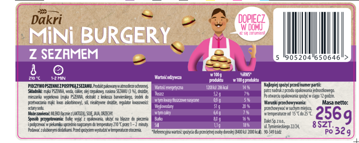 | Składniki | Mąka pszenna, woda, cukier, olej rzepakowy, nasiona sezamu (3 %), drożdże, mieszanka wypiekowa (mąka pszenna, ekstrakt z krokosza barwierskiego, środek do przetwarzania mąki: kwas askorbinowy), sól, nieaktywne drożdże, regulator kwasowości: octany sodu. |