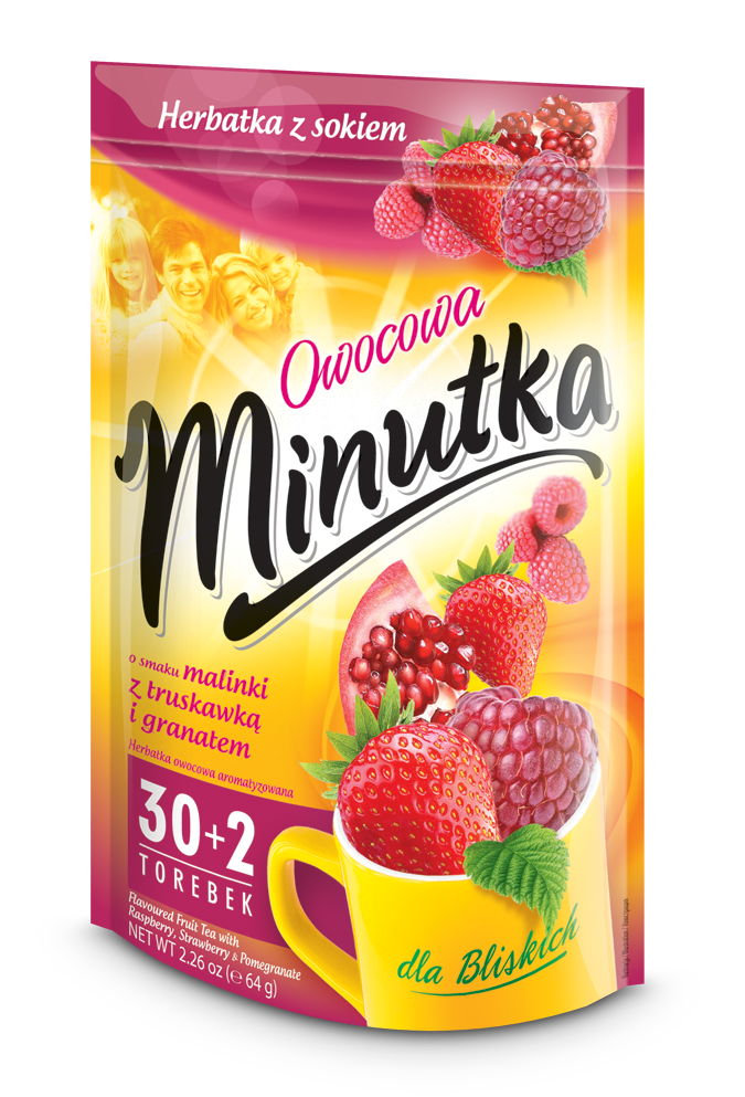 Herbata owocowa Minutka o smaku Maliny, Truskawki i Granatu to wyjątkowa propozycja dla osób lubiących połączenie herbaty i słodkich czerwonych owoców. Dzięki unikalnemu połączeniu składników, herbata posiada wyjątkowy smak i aromat. Saszetki zostały zapakowane w zamykane szczelnie opakowanie, które gwarantuje dłuższą świeżość produktu.