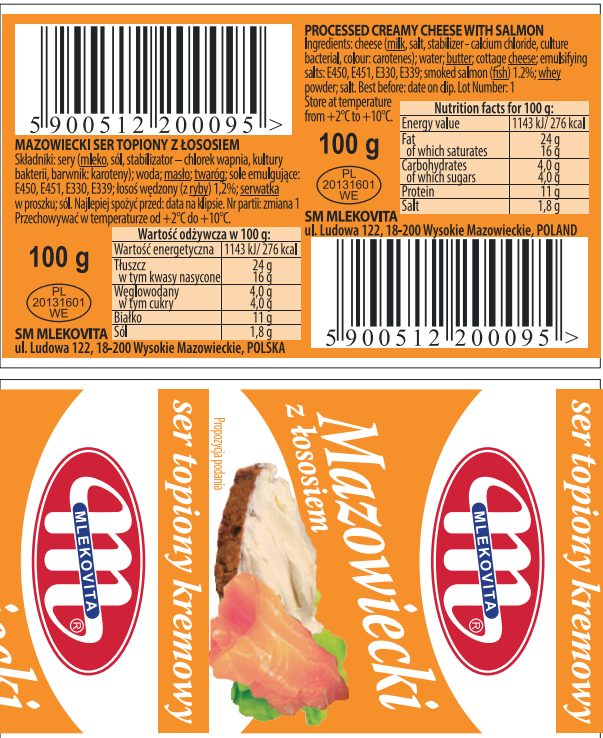 | Składniki | sery(mleko,sól,kulturybakterii,barwnik,annato),woda,twaróg:serwatka w proszku,sole emulgujące:E450 ,E450, łosoś 1,5% (ryba), sól,regulator kwasowości:kwas cytrynowy. |
