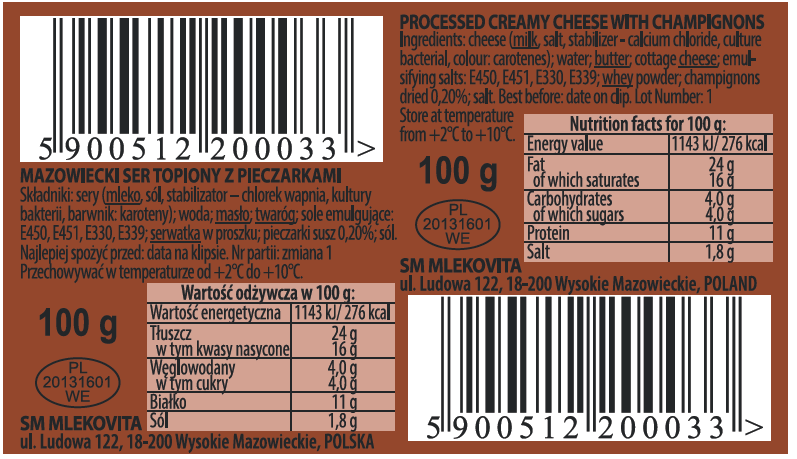 | Składniki | sery (mleko, sól, stabilizator - chlorek wapnia, kultury bakterii, barwnik: karoteny), woda; masło; twaróg; sole emulgujące: E450, E451, E330, E339; serwatka w proszku, pieczarki susz 0,20%; sól. |
