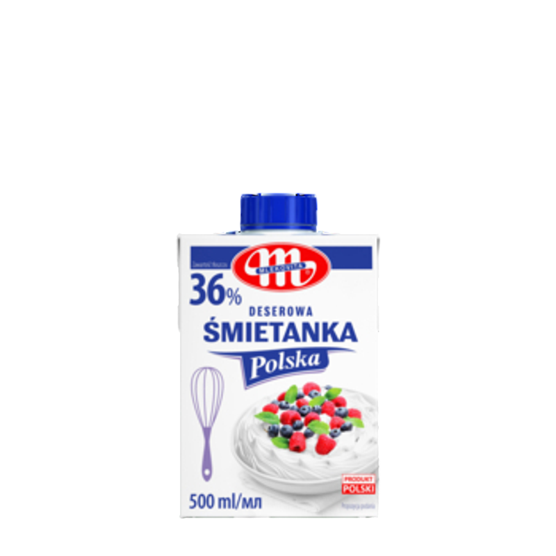 ŚMIETANKA UHT POLSKA 36% to nowość Mlekovity w asortymencie śmietanek Polskich w optymalnej porcji 500ml dostępna w wygodnych kartonikach z zakrętką. Jest produktem niezastąpionym w każdej kuchni,idealnym do kremów i deserów. Łatwo i szybko się ubija, gdy jest dobrze schłodzona,pozwalając uzyskać doskonałą ,aksamitna konsystencję bitej śmietany.
