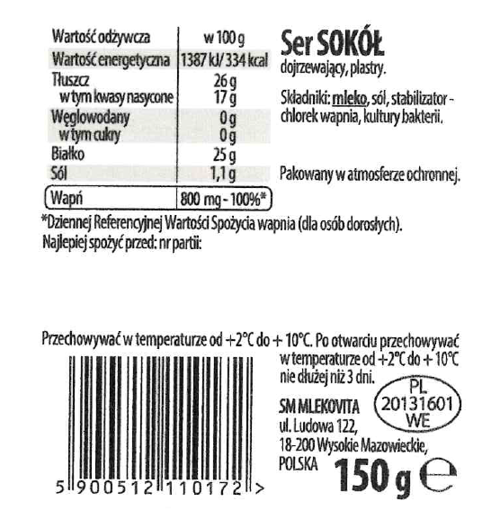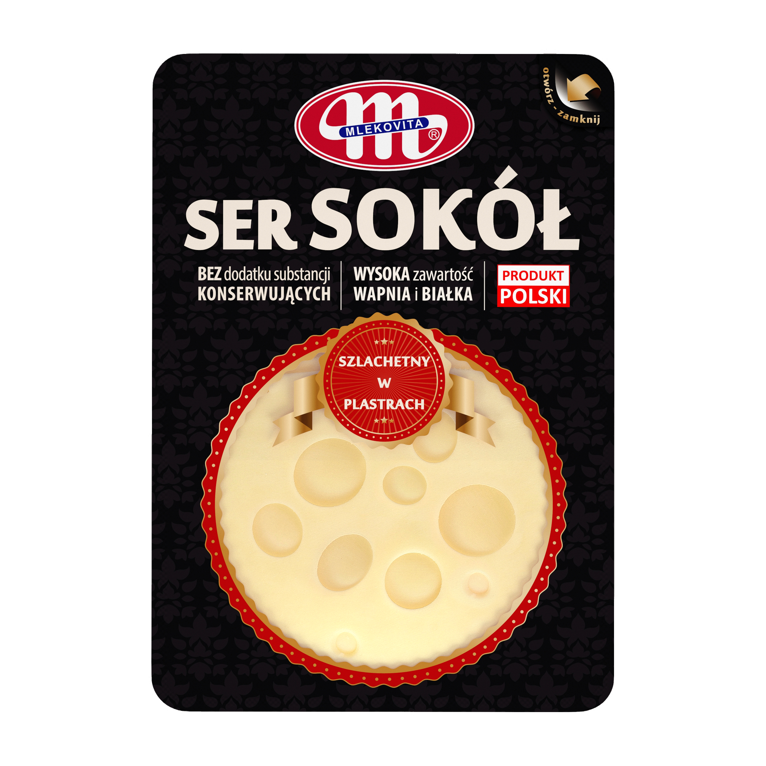 Ser SOKÓŁ jest serem dojrzewającym typu szwajcarskiego. Tradycja dobrego smaku sera SOKÓŁ kultywowana przez Mlekovitę od 1993 r. uwidacznia się w unikalnej recepturze i wyrazistym słodkawo-orzechowym smaku. Nazwa nawiązująca do jednego z najszlachetniejszych polskich ptaków podkreśla polskość, wyjątkowe walory i wysoką jakość produktu. Ser SOKÓŁ jest skoncentrowanym źródłem składników odżywczych: łatwo przyswajalnego białka i wapnia (100 g sera pokrywa 100% dziennego zapotrzebowania na wapń). Idealny na kanapki, deskę serów, do tostów i innych zastosowań kulinarnych. Wygodne opakowanie z funkcją otwórz – zamknij pozwala dłużej cieszyć się oryginalnym smakiem i świeżością sera.