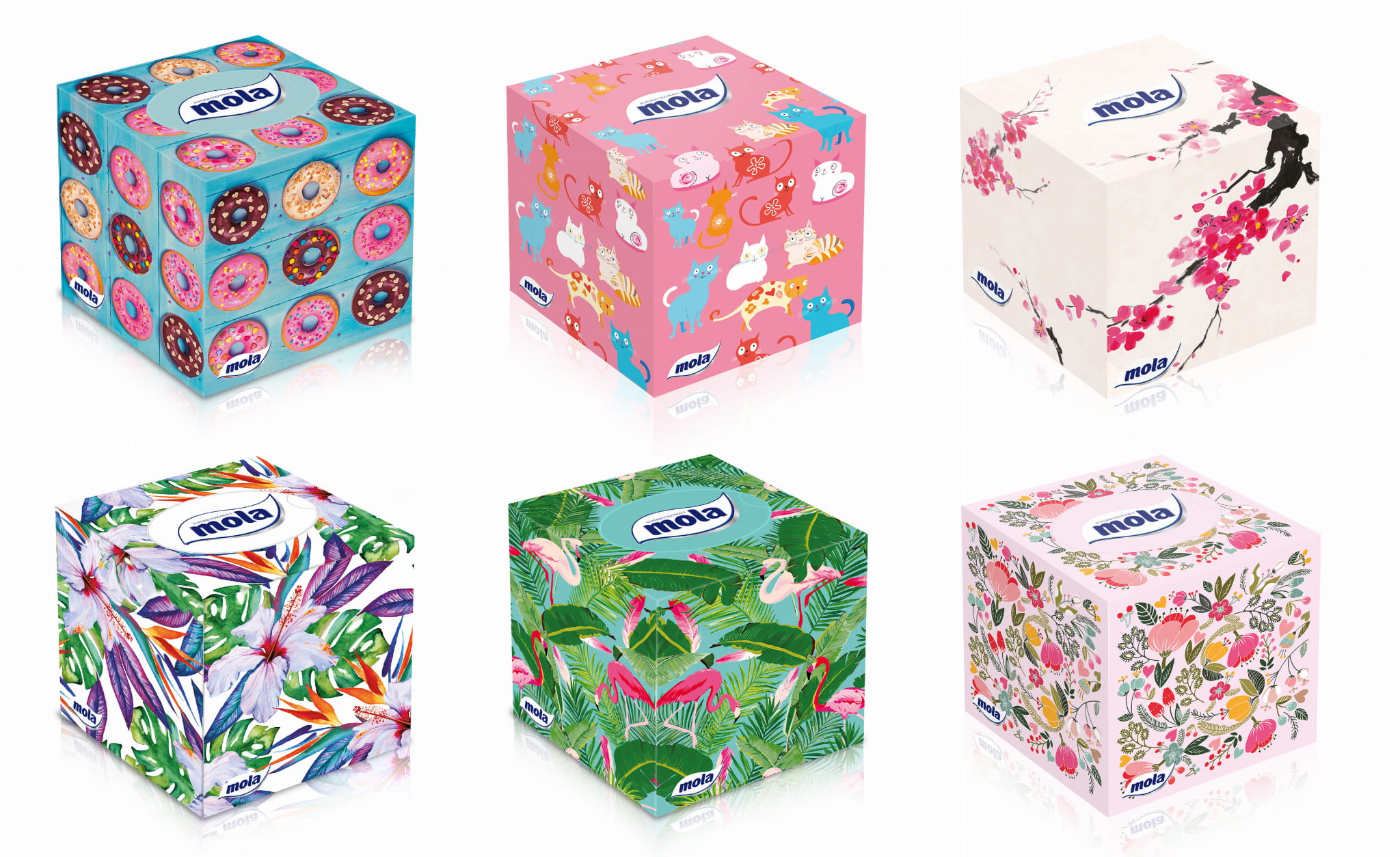 Chusteczki Mola Cubic to miękkie, 3-warstwowe chusteczki kosmetyczne z czystej celulozy. Ich stylowe, nowoczesne opakowania będą pięknie wyglądać w Twoim mieszkaniu. Do wyboru jest aż 6 wzorów: w motywy kwiatowe, zabawne kociaki oraz najmodniejsze flamingi i słodkie donaty.