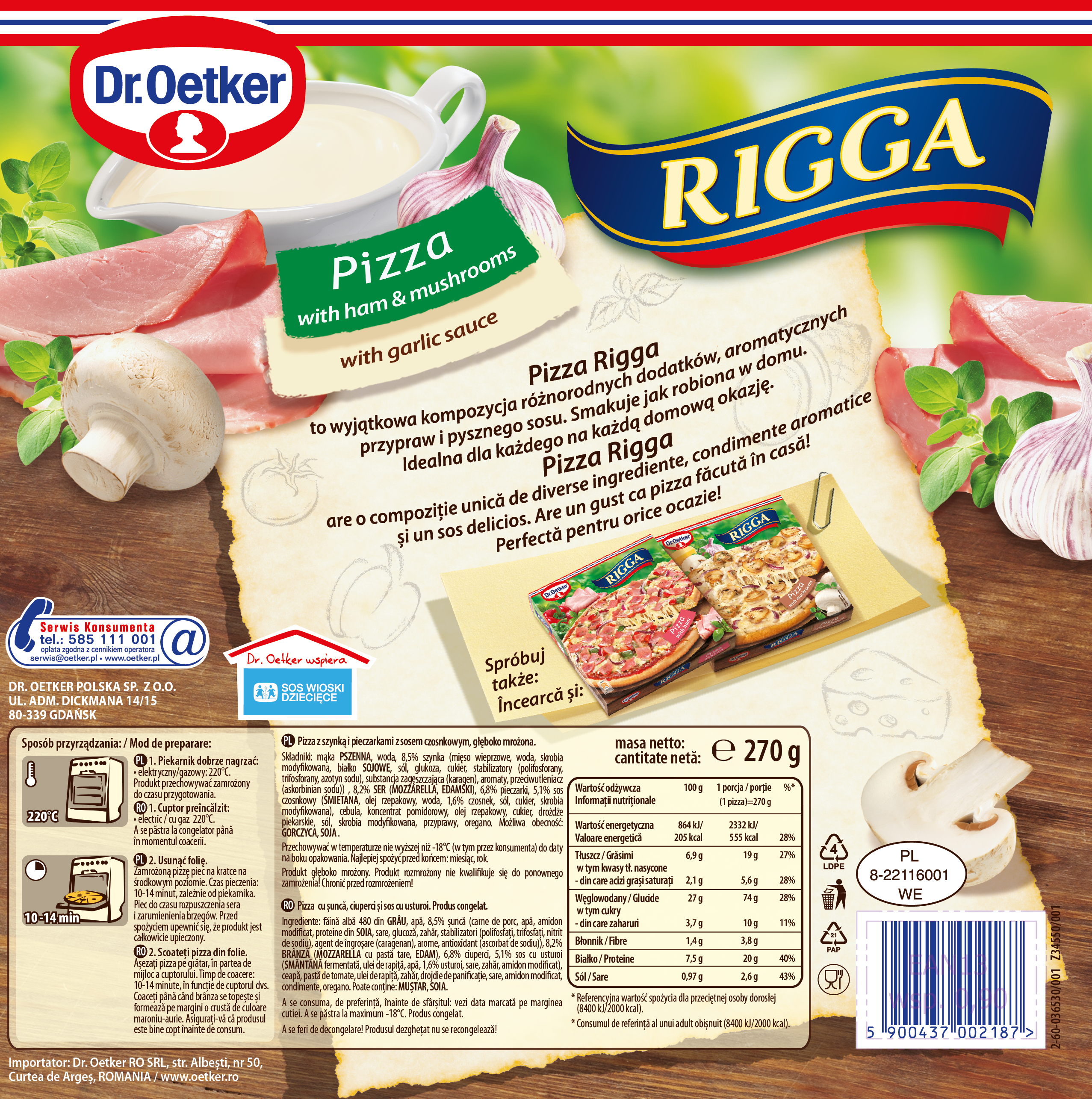 | Składniki | Mąka PRZENNA, woda, 8,5% szynka (mięso wieprzowe, woda, skrobia modyfikowana, białko SOJOWE, sól, glukoza, cukier, stabilizatory (polifosforany, trifosforany, azotyn sodu), substancja zagęszczająca (karagen), aromaty, przeciwutleniacz (askorbian sodu)), 8,2% SER (MOZARELLA, EDAMSKI), 6,8% pieczarki, 5,1% sos czosnkowy (ŚMIETANA, olej rzepakowy, woda, 1,6% czosnek, sól, cukier, skrobia modyfikowana), cebula, koncentrat pomidorowy, olej rzepakowy, cukier, drożdże piekarskie, sól, skrobia modyfikowana, przyprawy, oregano. Możliwa obecność: GORCZYCA, SOJA. |