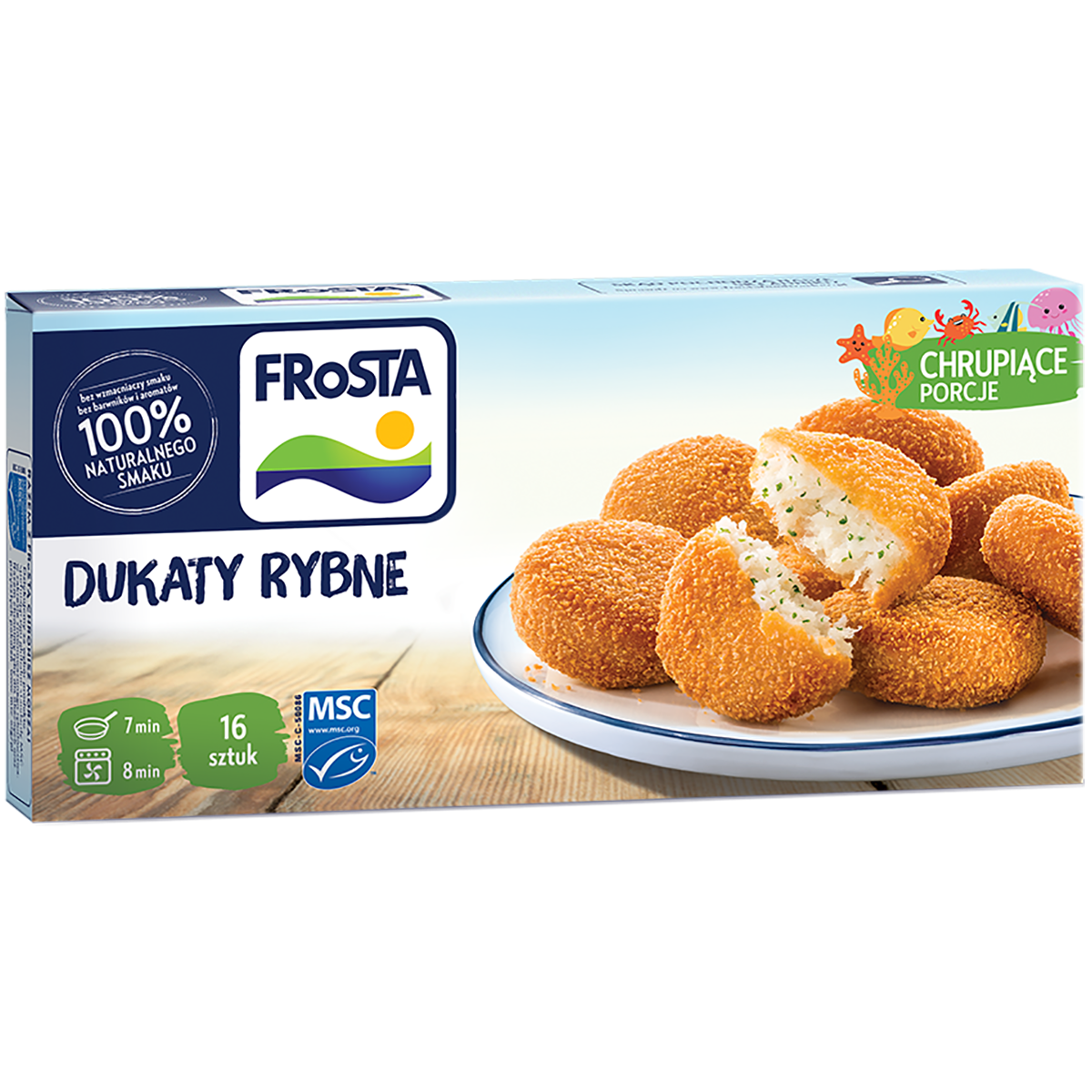 | Składniki | RYBA 53% (A – mintaj, D – morszczuk; patrz nadruk w polu kodowym), panierka sypka 14% (mąka PSZENNA, sól, papryka mielona, drożdże), mąka PSZENNA, olej rzepakowy, woda, skrobia ziemniaczana, mąka ryżowa, sól, pietruszka, pieprz czarny, drożdże |