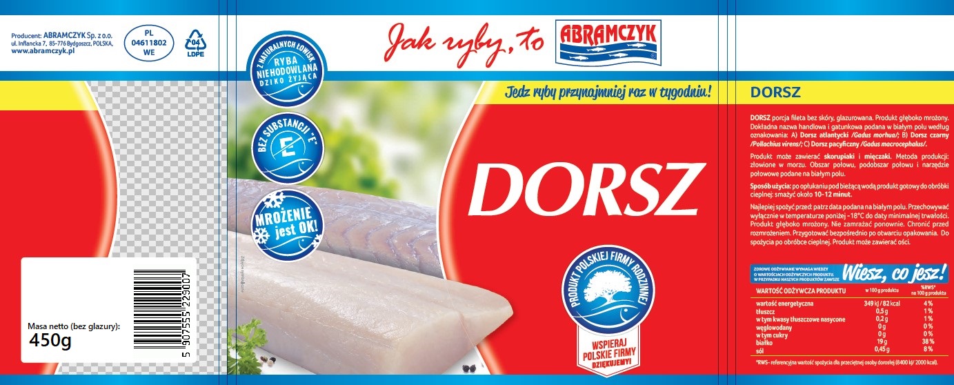 | Składniki | Dorsz porcje fileta bez skóry 100%. a) dorsz atlantycki, gadus morhua. b) dorsz czarny, pollachius virens. c) dorsz pacyficzny, gadus macrocephalus. |