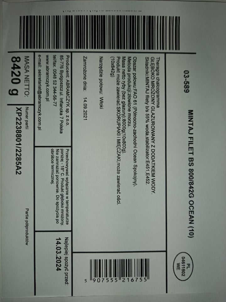 | Składniki | Mintaj filet 55%, woda, stabilizator: E 451.E 452 |
