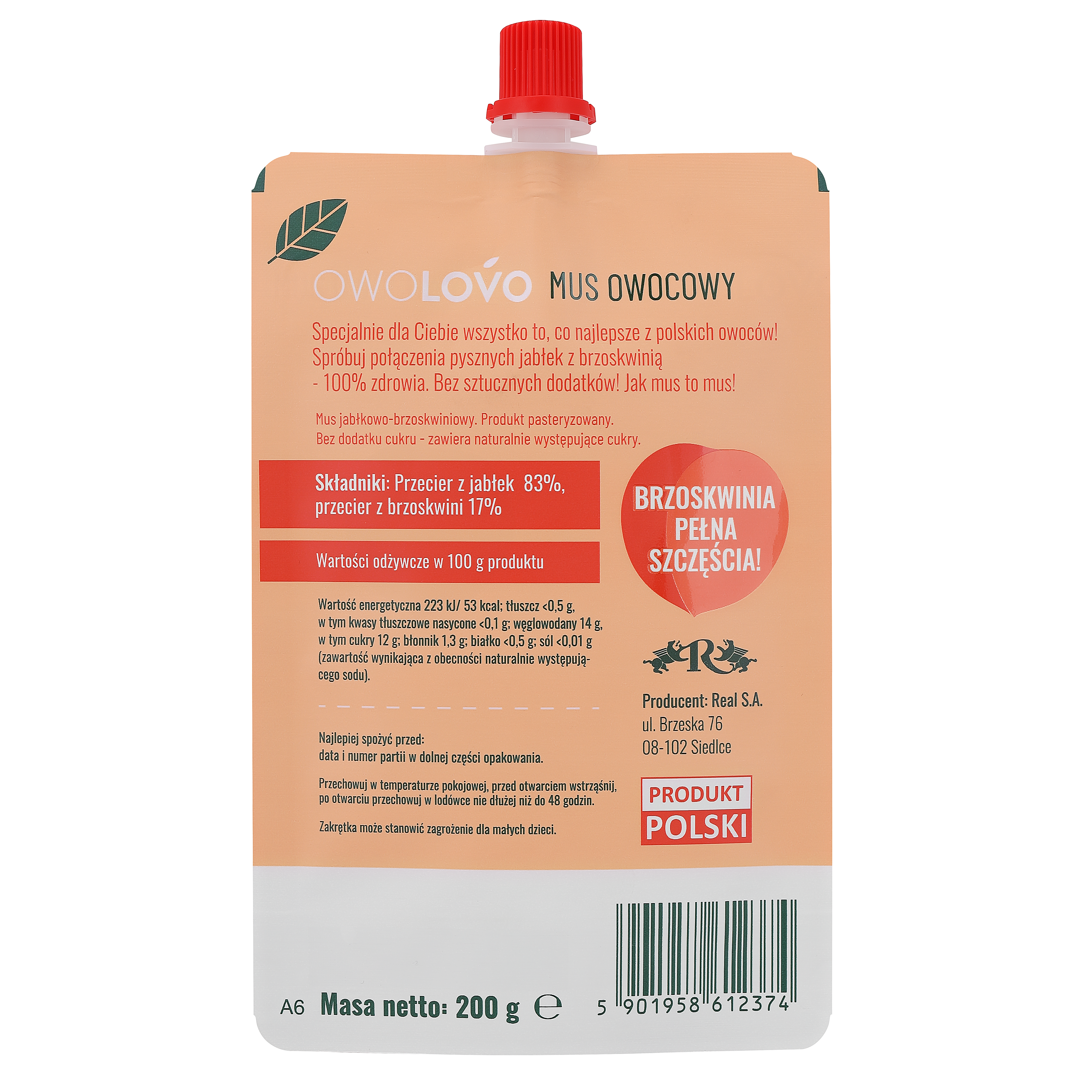 Krótki opis marketingowy BRZOSKWINIOWO * Mus jabłkowo-brzoskwiniowy 200g. Specjalnie dla Ciebie wszystko to, co najlepsze z polskich owoców. Spróbuj połączenia pysznych jabłek z brzoskwiniami z sandomierskich sadów – 100% zdrowia. Bez sztucznych dodatków! Nie zawiera alergenów!