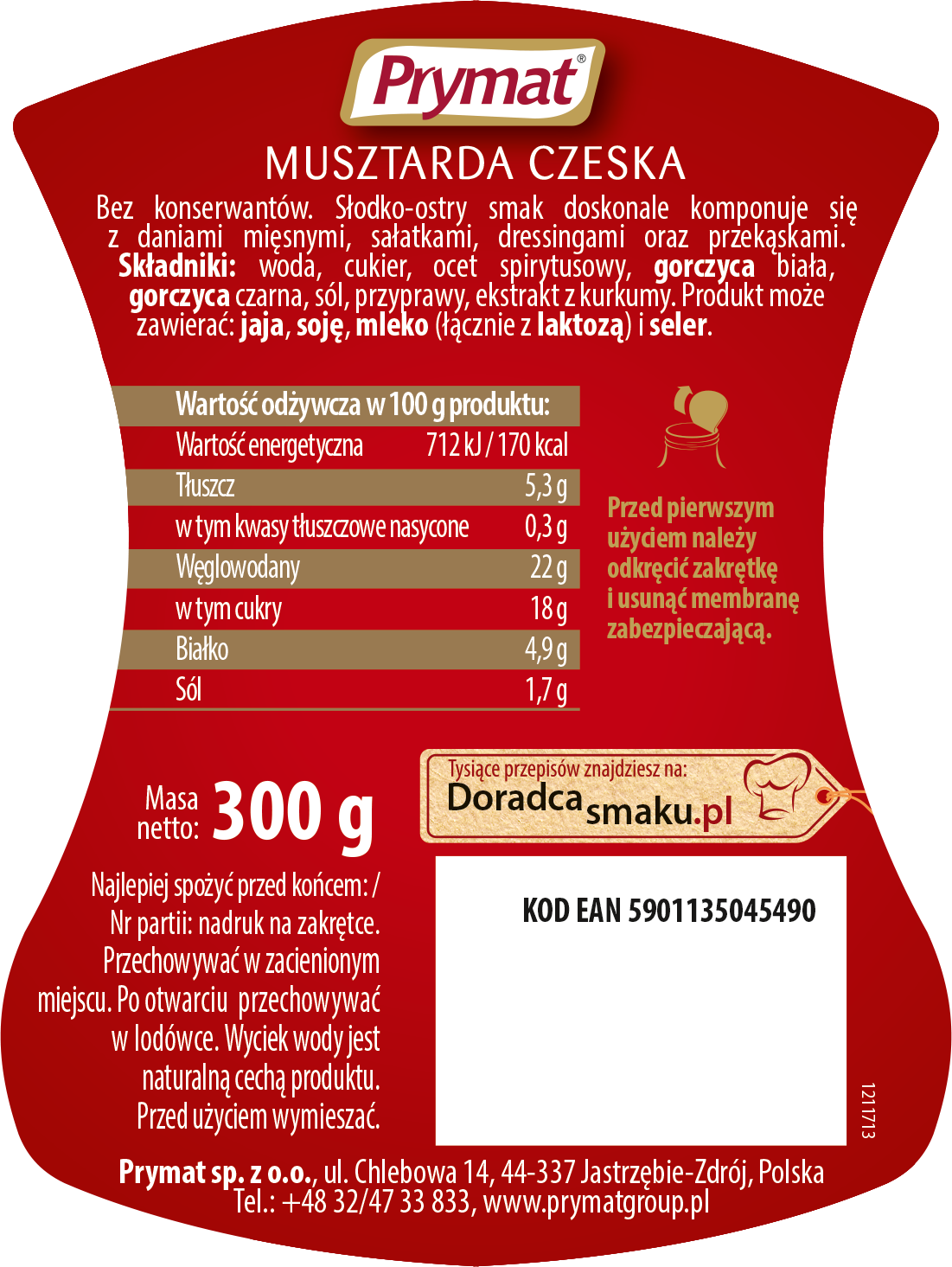 Musztarda czeska Prymat ma niecodzienny: pobudzający zmysły, słodki i jednocześnie ostry smak oraz kremową konsystencję z widocznymi białymi i czarnymi ziarnami gorczycy. Znakomicie pasuje do kanapek, dań mięsnych, sałatek, przekąsek i sosów. Dostępna w wydajnym i poręcznym opakowaniu PET o pojemności 300 gramów