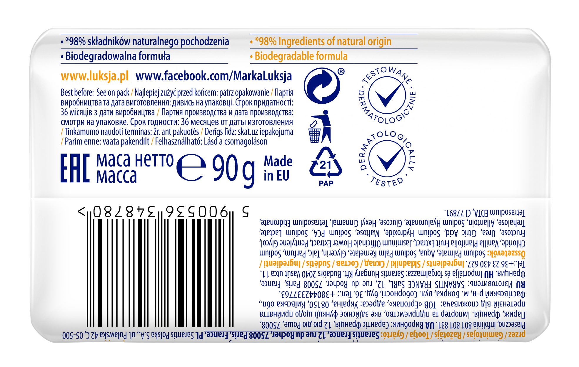 SkładSodium Palmate, Aqua, Sodium Palm Kernelate, Glycerin, Talc, Parfum, Sodium Chloride, Vanilla Planifolia Fruit Extract, Jasminum Officinale Flower Extract, Pentylene Glycol, Fructose, Urea, Citric Acid, Sodium Hydroxide, Maltose, Sodium PCA, Sodium Lactate, Trehalose, Allantoin, Sodium Hyaluronate, Glucose, Hexyl Cinnamal, Tetrasodium Etidronate, Tetrasodium EDTA, CI 77891.