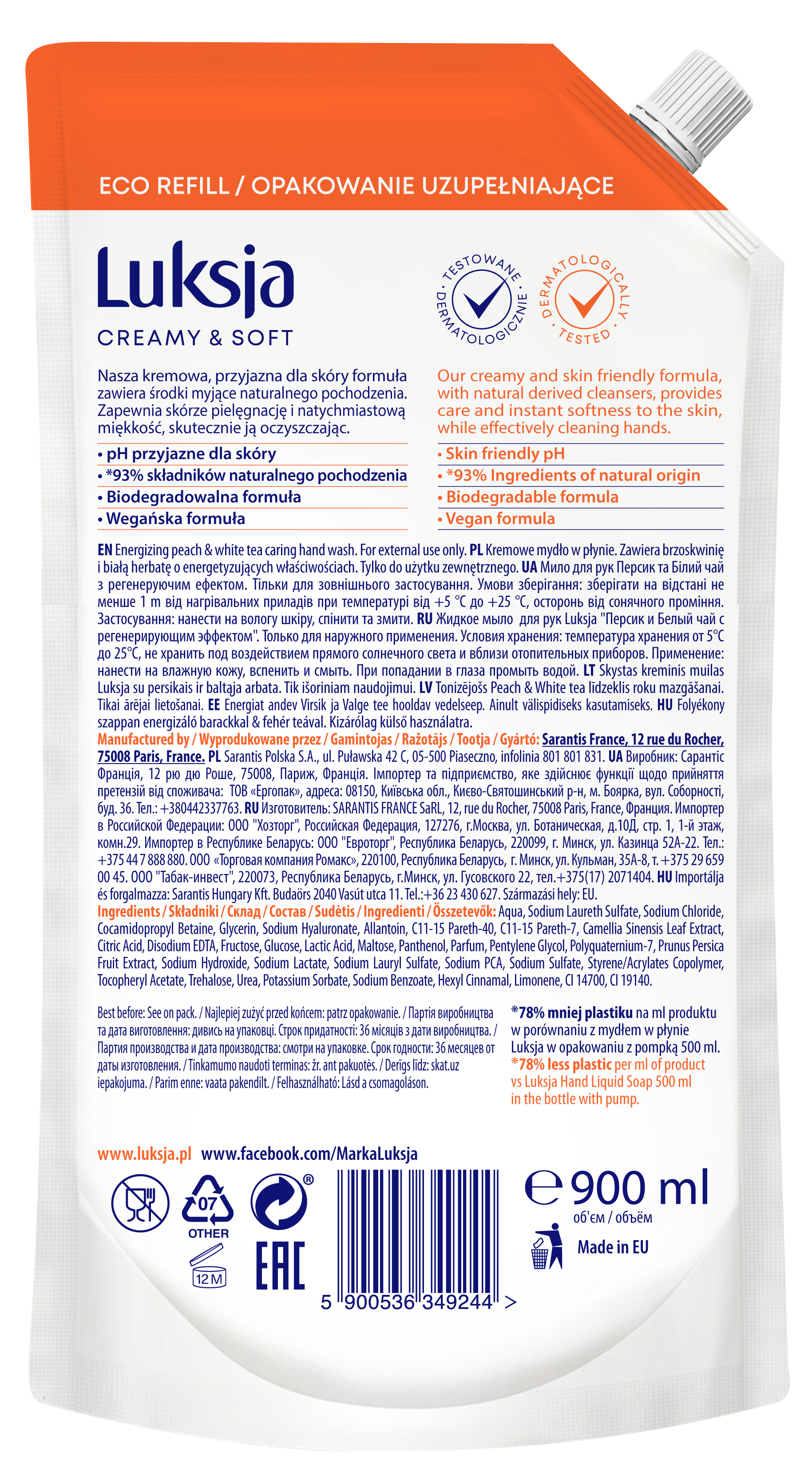 Mydło w płynie Luksja Creamy&Soft brzoskwinia i biała herbata zapas 900 ml