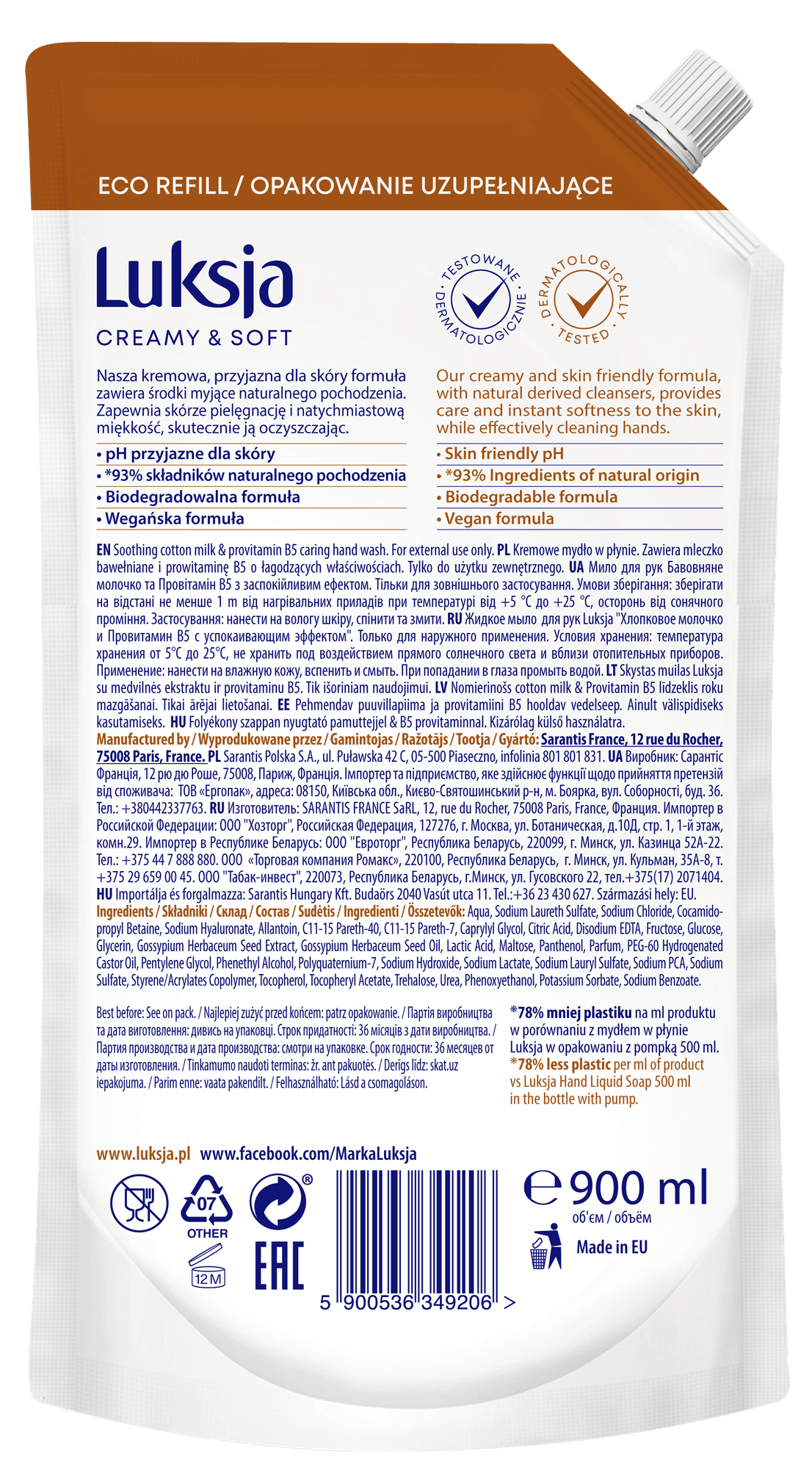 Mydło w płynie Luksja Creamy&Soft mleczko bawełniane i prowitamina B5 zapas 900 ml