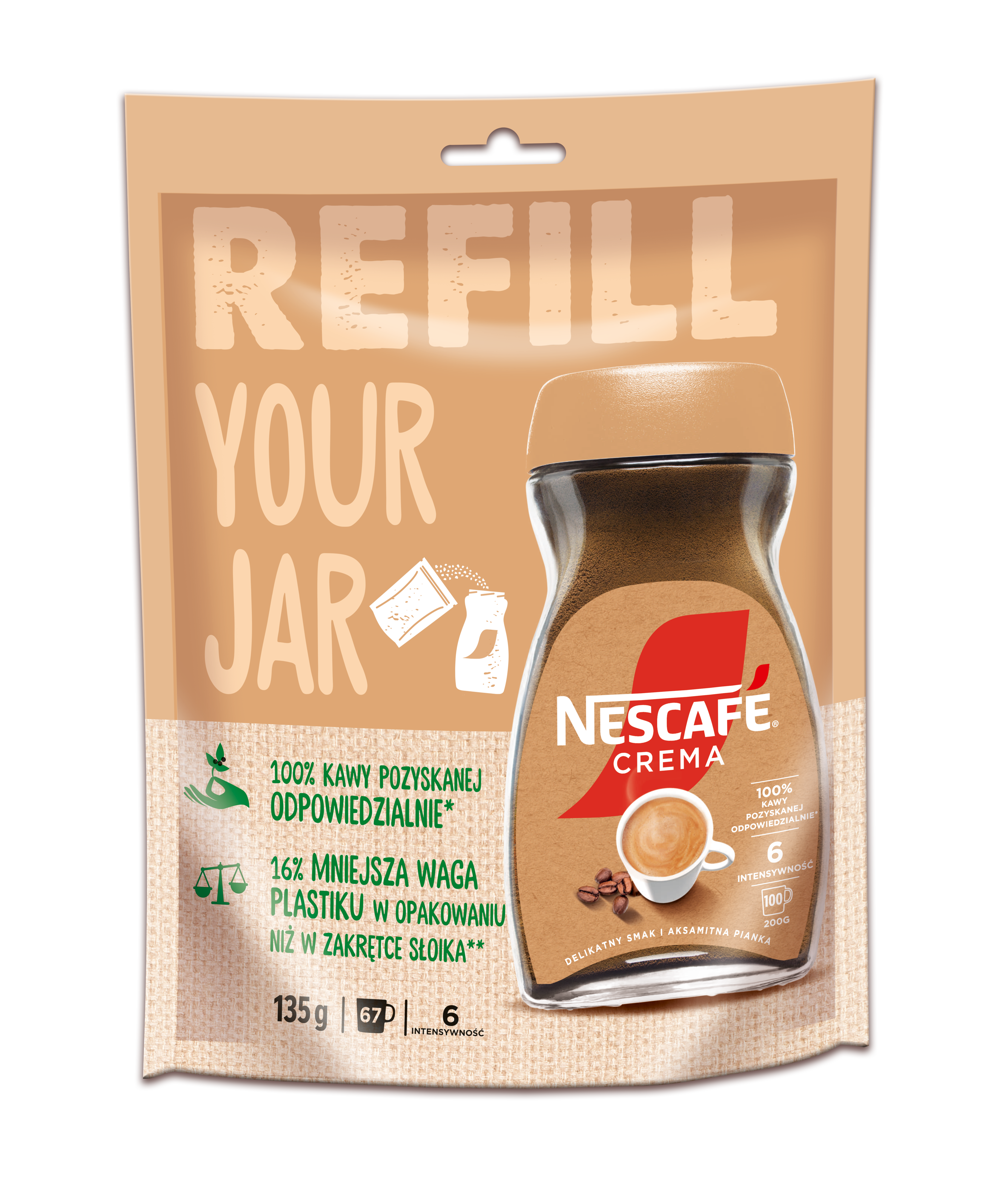 Użyj tego opakowania, aby napełnić słoik kawą NESCAFE Crema i ciesz się delikatnym smakiem i aksamitna pianką. Chwila dla Ciebie by spokojnie zacząć dzień. To opakowanie może zostać ponownie zamknięte, jeżeli zostało w nim jeszcze trochę kawy. Ta kawa została w 100 % pozyskana w sposób odpowiedzialny.