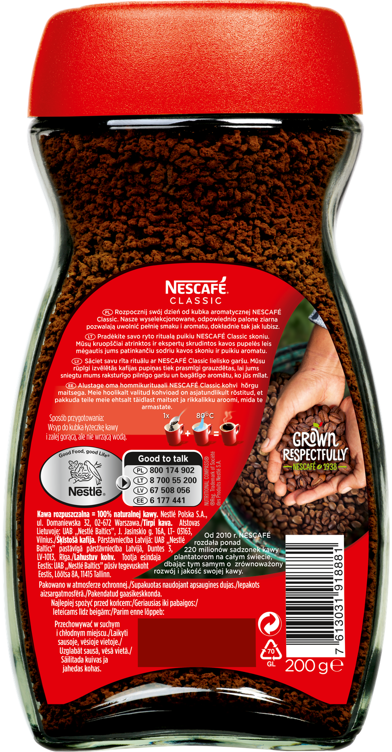 Zacznij dzień z Nescafé Classic, najpopularniejszą kawą rozpuszczalną w Polsce i na świecie. Dostępną na rynku od ponad 80 lat w ponad 180 krajach!
