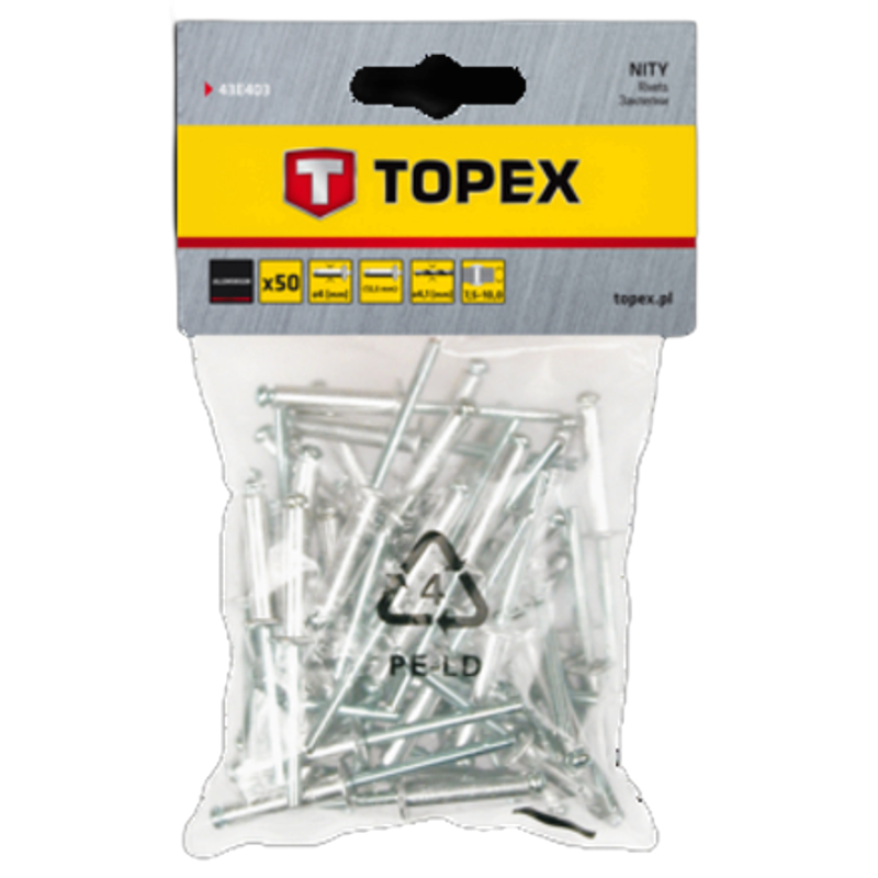 Nity aluminiowe TOPEX (nr ref. 43E403) o wymiarach 4.0 x 12.5 mm. W opakowaniu 50 sztuk. Nity z łbem kulistym - pełne, do zakuwania. Ten typ nitów zapewnia wyjątkowo mocne połączenie szerokiej gamy elementów, jak blachy, drewno, tworzywa, skóry itp. Nit po zamocowaniu w otworze zakuwa się od strony końca trzpienia, tworząc stałe, odporne na poluzowanie połączenie. Marka TOPEX skierowana jest do majsterkowiczów.