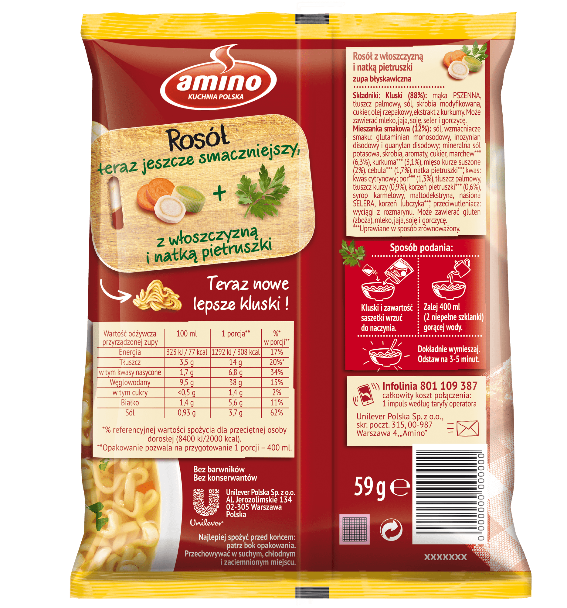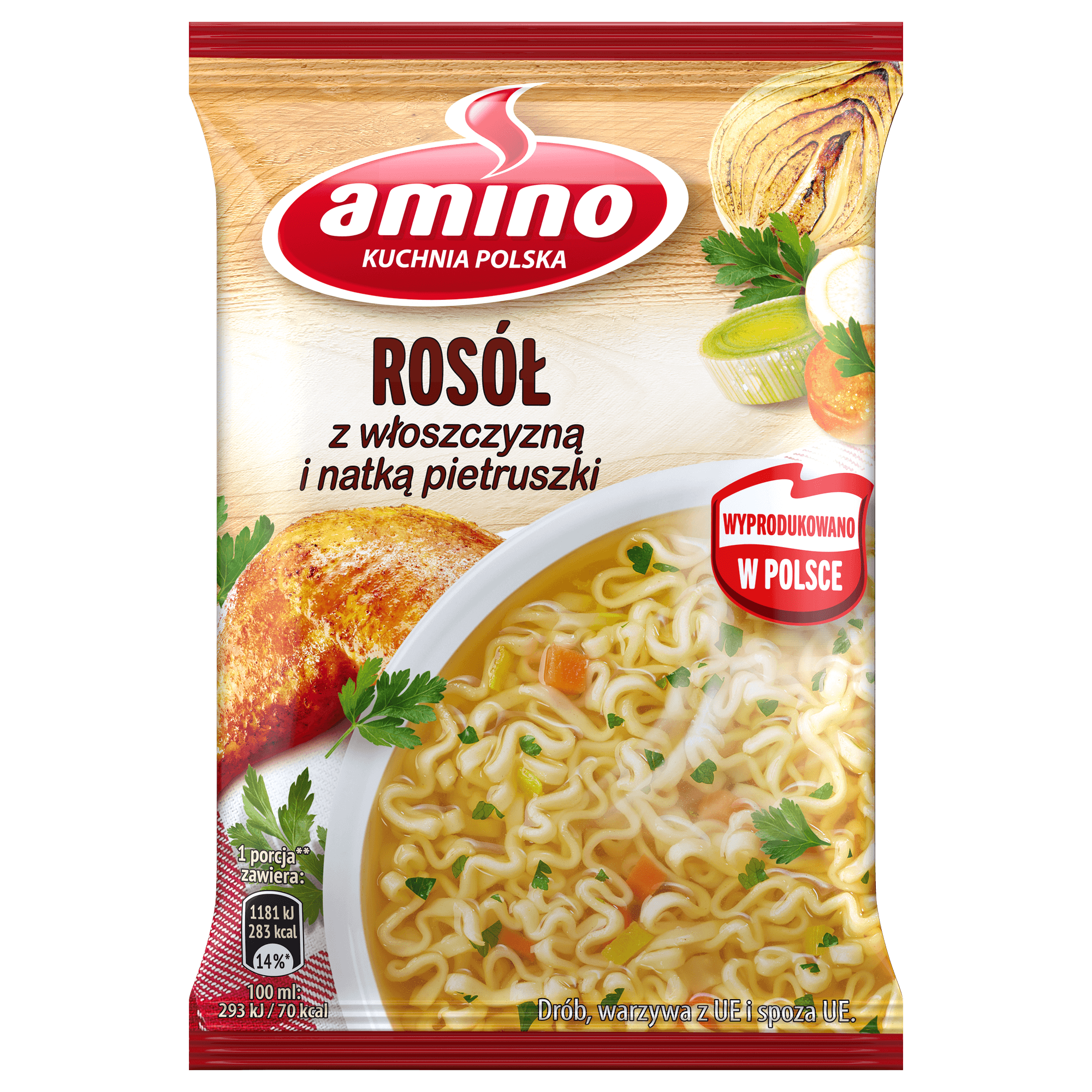 | Składniki | Kluski (88%): mąka pszenna, tłuszcz palmowy, sól, skrobia modyfikowana, cukier, olej rzepakowy, ekstrakt z kurkumy, mieszanka smakowa (12%): sól, wzmacniacze smaku: glutaminian monosodowy, inozynian disodowy i guanylan disodowy; mineralna sól potasowa, skrobia, aromaty, cukier, marchew*** (6,3%), kurkuma*** (3,1%), mięso kurze suszone (2%), cebula*** (1,7%), natka pietruszki***, kwas: kwas cytrynowy; por*** (1,3%), tłuszcz palmowy, tłuszcz kurzy (0,9%), korzeń pietruszki*** (0,6%), syrop karmelowy, maltodekstryna, nasiona selera, korzeń lubczyka***, przeciwutleniacz: wyciągi z rozmarynu,***uprawiane w sposób zrównoważony |