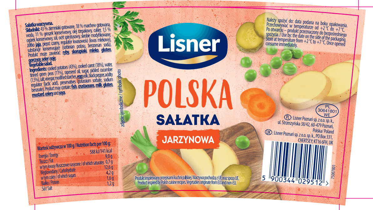| Składniki | 43 % ziemniaki gotowane, 18 % marchew gotowana, woda, 11 % groszek konserwowy, olej rzepakowy, cukier, 1,5 % ogórek konserwowy, sól, ocet spirytusowy, skrobia modyfikowana, żółtko jaja, pieprz czarny, regulator kwasowości (kwas mlekowy), substancje konserwujące (sorbinian potasu, benzoesan sodu). |