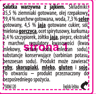 | Składniki | 35,5 % ziemniaki gotowane, olej rzepakowy, 19,4 % marchew gotowana, woda, 7,3 % seler gotowany, 4,5 % jaja gotowane cukier, sól, mielona gorczyca, ocet spirytusowy, kurkuma, 0,4 % szczypiorek, żółtko jaja, pieprz, ekstrakt z marchwi, regulatory kwasowości (kwas mlekowy, octany sodu, mleczan sodu), substancje konserwujące (sorbinian potasu, benzoesan sodu). |