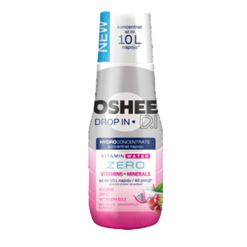 OSHEE Drop In to innowacyjna linia koncentratów nawadniających. OSHEE Drop In Hydroconcentrate Vitamin Water Witaminy i Minerały Zero to produkt o wieloporcjowej skoncentrowanej formie o smaku smoczego owocu i winogron, do samodzielnego przygotowania w ulubionych smakach OSHEE.
