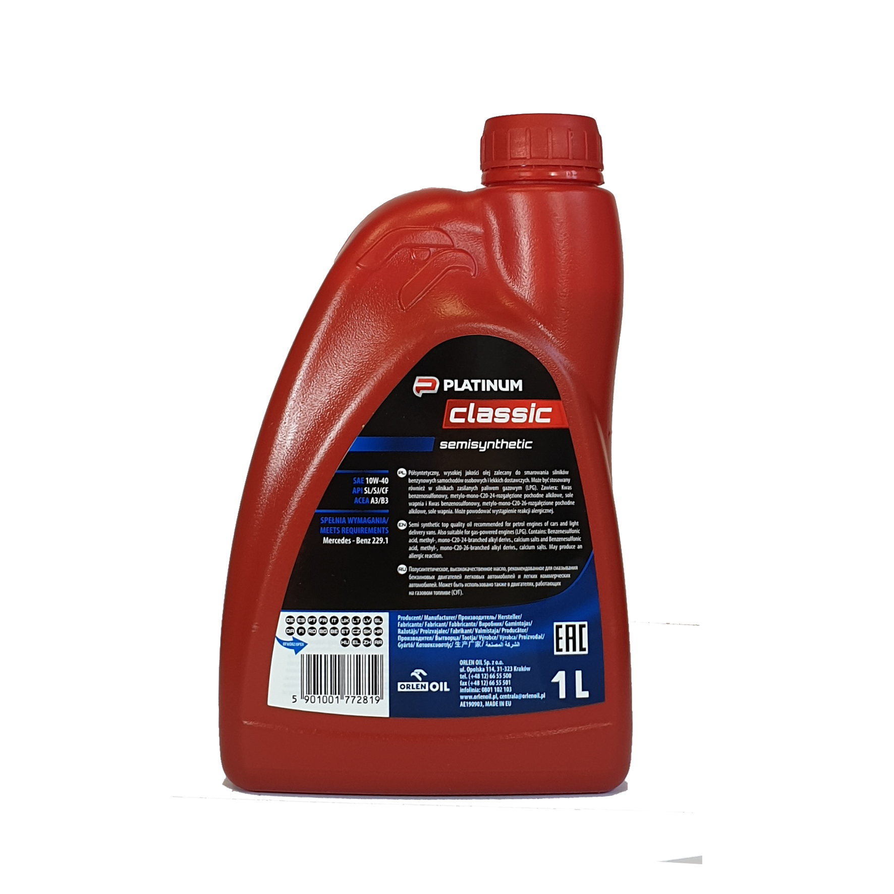 Wysokiej jakości, mineralny, wielosezonowy olej silnikowy opracowany z myślą o silnikach benzynowych i lekkich Diesla eksploatowanych w codziennych warunkach jazdy. Technologia oleju gwarantuje nie tylko optymalną ochronę silnika w każdych warunkach eksploatacji, ale zapewnia także doskonałe parametry oleju, redukuje ryzyko nadmiernego zużycia zaworów przy jednoczesnej, wysokiej kontroli osadów. PLATINUM Classic mineral 15W-40 zalecany jest do użycia zarówno w samochodach osobowych z silnikami benzynowymi i Diesla, jak również w lekkich samochodach dostawczych i furgonetkach. Stworzony z myślą o każdym kierowcy, dlatego doskonale sprawdza się w pojazdach poruszających się w ruchu miejskim jak również na trasach szybkiego ruchu. Przeznaczony do smarowania silników pracujących w normalnych warunkach eksploatacji zarówno w okresie letnim jak i zimowym. Nie ma zastrzeżeń, by olej stosować do silników starszych typów, gdzie producent zaleca używanie olejów klas niższych.