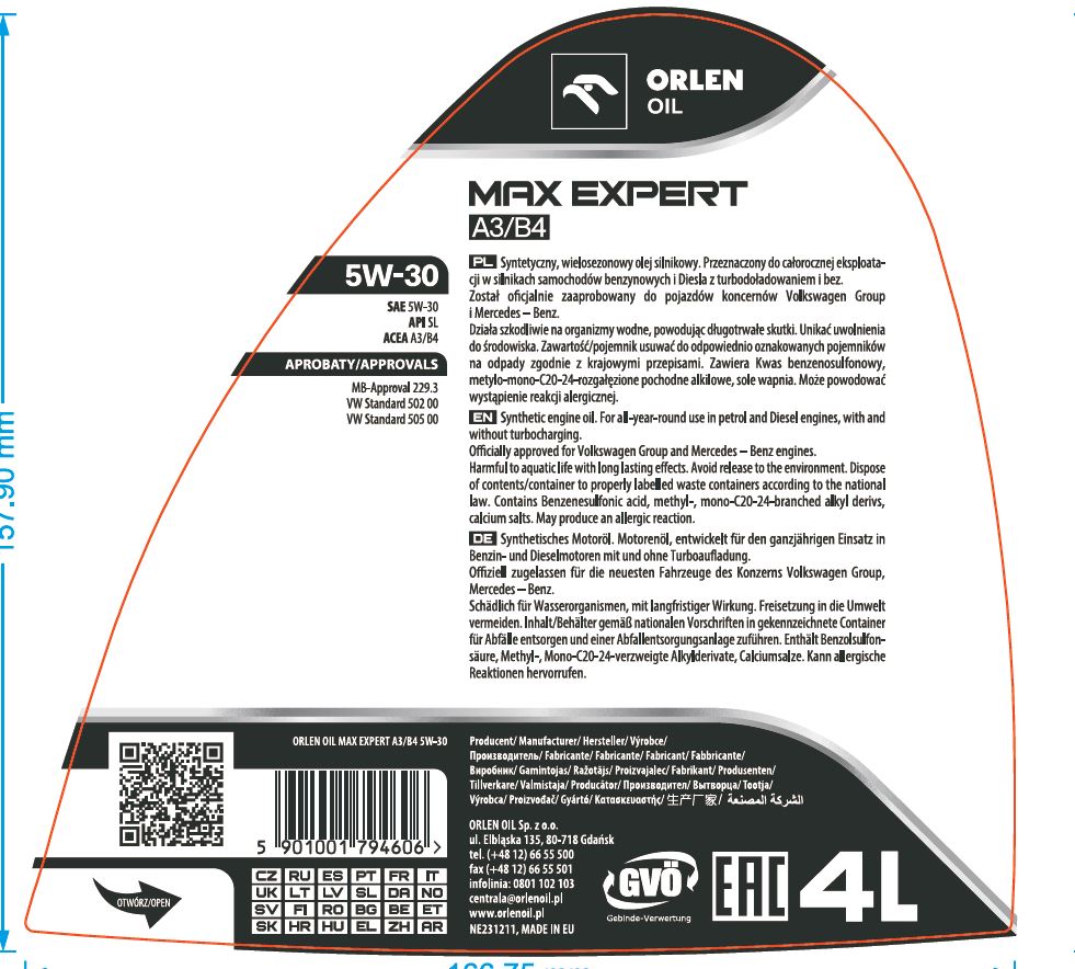 Najwyższej jakości, syntetyczny, wielosezonowy olej silnikowy typu Mid SAPS o niskiej lepkości. Dzięki unikalnej technologii Complex Protection Formula (CPF) daje idealną kompozycję najnowocześniejszych komponentów, które w połączeniu z wysokiej jakości olejami bazowymi zapewnia idealną pracę silnika przy jednoczesnej redukcji osadów i ryzyka zużycia zaworów. PLATINUM Max Expert XD 5W-30 to olej kompatybilny z urządzeniami obróbki spalin DPF (filtr cząstek stałych) i TWC (katalizator trójfunkcyjny). PLATINUM Max Expert XD 5W-30 to unikalny, wielosezonowy olej silnikowy typu Mid SAPS. Rekomendowany do pracy w pojazdach osobowych i lekkich dostawczych wyposażonych w wysokoprężne silniki Diesla lub silniki benzynowe o zapłonie iskrowym z turbo doładowaniem lub bez, wyposażonych w systemy redukcji spalin takie jak DPF lub TWC. Świetne parametry lepkościowo-temperaturowe gwarantują niezawodną pracę silnika zarówno latem i zimą w ruchu miejskich oraz na trasach szybkiego ruchu. Odpowiada poziomowi jakości normy ILSAC GF-4. Rekomendowany do pojazdów spełniających normy Euro 6.