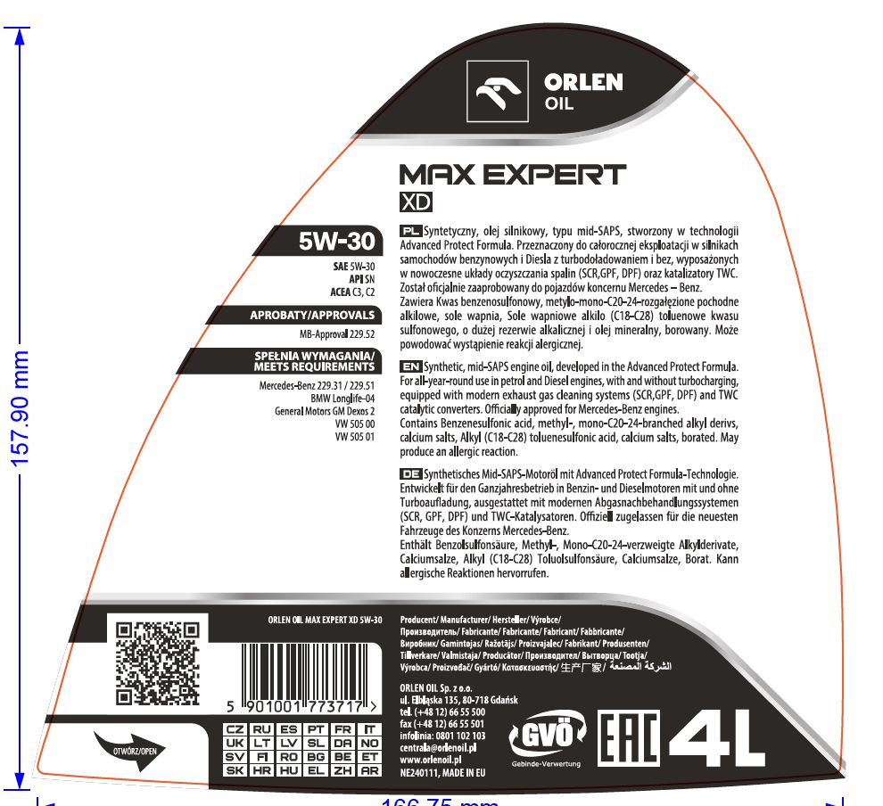 Najwyższej jakości, syntetyczny, wielosezonowy olej silnikowy typu Mid SAPS o niskiej lepkości. Dzięki unikalnej technologii Complex Protection Formula (CPF) daje idealną kompozycję najnowocześniejszych komponentów, które w połączeniu z wysokiej jakości olejami bazowymi zapewnia idealną pracę silnika przy jednoczesnej redukcji osadów i ryzyka zużycia zaworów. PLATINUM Max Expert XD 5W-30 to olej kompatybilny z urządzeniami obróbki spalin DPF (filtr cząstek stałych) i TWC (katalizator trójfunkcyjny). PLATINUM Max Expert XD 5W-30 to unikalny, wielosezonowy olej silnikowy typu Mid SAPS. Rekomendowany do pracy w pojazdach osobowych i lekkich dostawczych wyposażonych w wysokoprężne silniki Diesla lub silniki benzynowe o zapłonie iskrowym z turbo doładowaniem lub bez, wyposażonych w systemy redukcji spalin takie jak DPF lub TWC. Świetne parametry lepkościowo-temperaturowe gwarantują niezawodną pracę silnika zarówno latem i zimą w ruchu miejskich oraz na trasach szybkiego ruchu. Odpowiada poziomowi jakości normy ILSAC GF-4. Rekomendowany do pojazdów spełniających normy Euro 6.