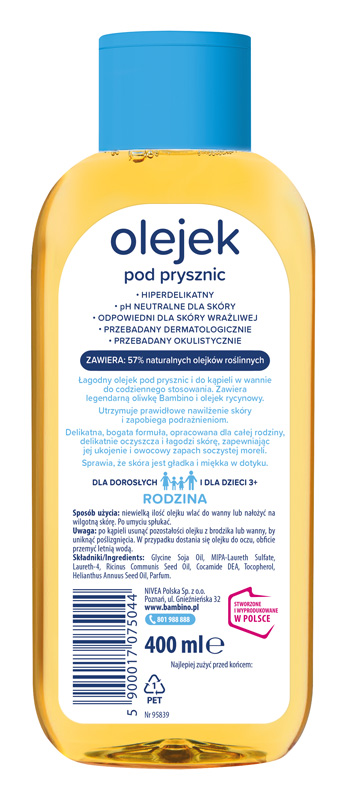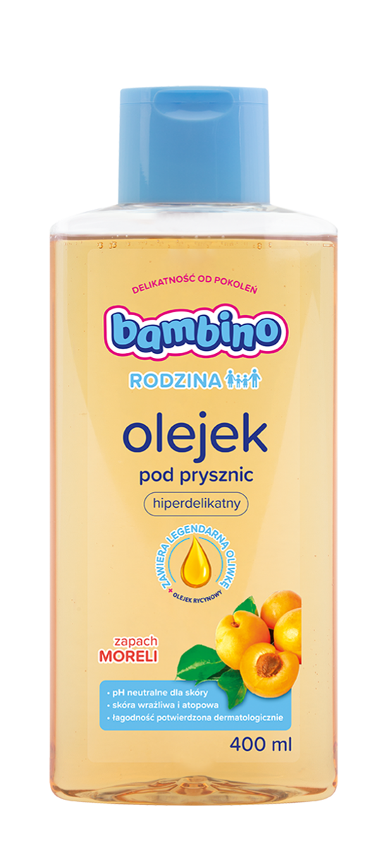 Bambino RODZINA Żel pod prysznic to łagodny kosmetyk pod prysznic i do kąpieli w wannie do codziennego stosowania. Zawiera legendarną oliwkę Bambino i pantenol. Utrzymuje prawidłowe nawilżenie skóry i pomaga zapobiegać podrażnieniom. Delikatna, lekka formuła, opracowana dla całej rodziny, skutecznie oczyszcza skórę i pozostawia uczucie świeżości oraz subtelny zapach. Sprawia, że skóra jest gładka i miękka w dotyku. - hipoalergiczny - pH neutralne dla skóry - wymyślony i wyprodukowany w Polsce - odpowiedni dla skóry wrażliwej - przebadany dermatologicznie - przebadany okulistycznie.