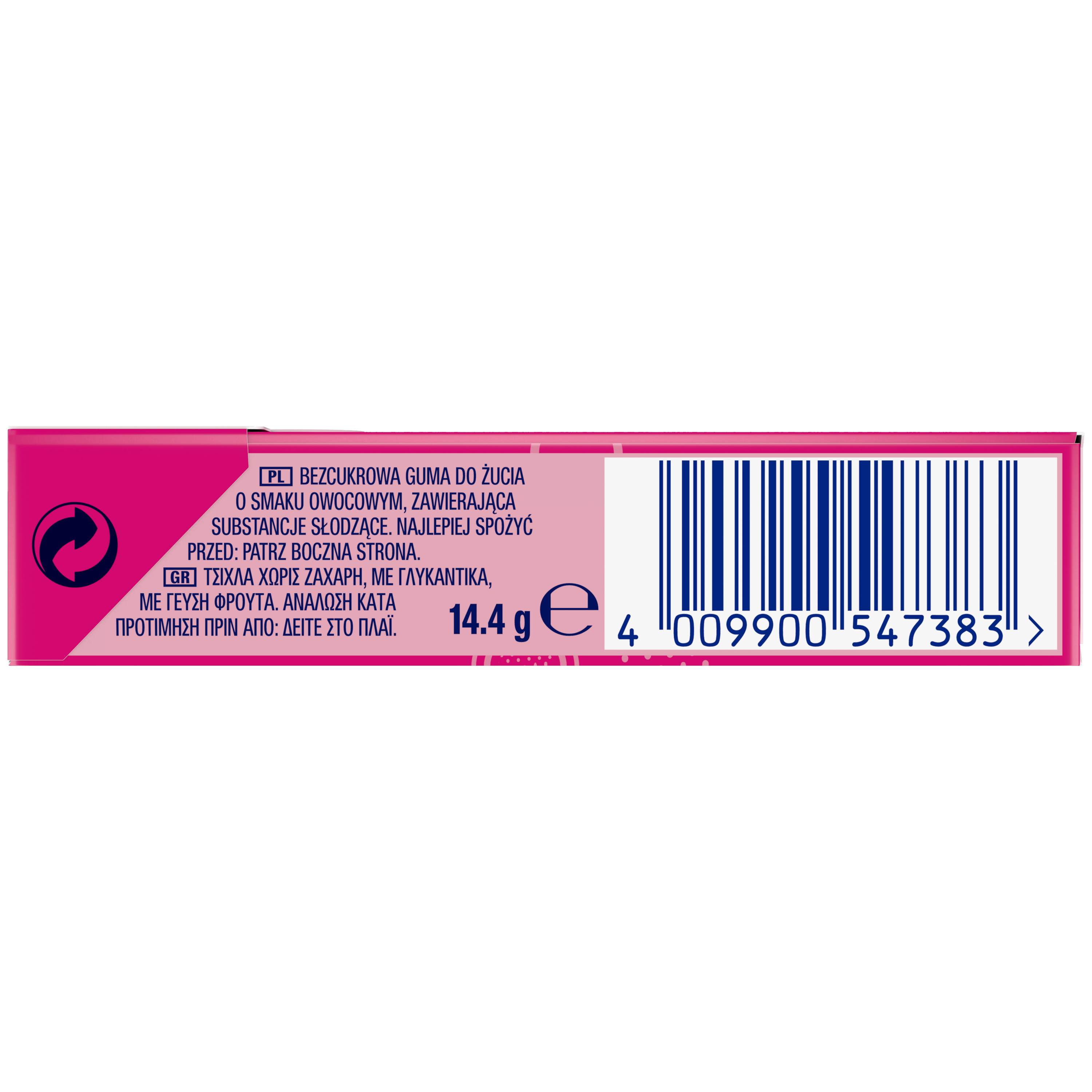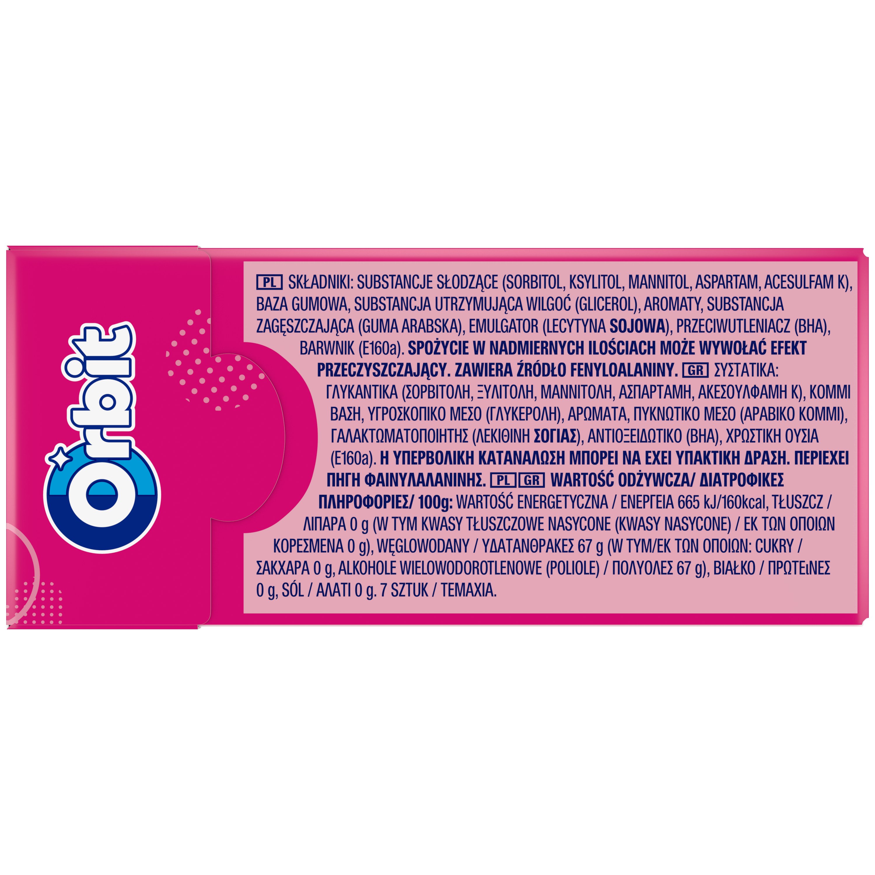 | Składniki | Substancje słodzące (sorbitol, ksylitol, mannitol, aspartam, acesulfam k), baza gumowa, substancja utrzymująca wilgoć (glicerol), aromaty, substancja zagęszczająca (guma arabska), emulgator (lecytyna sojowa), przeciwutleniacz (bha), barwnik (e160a). |