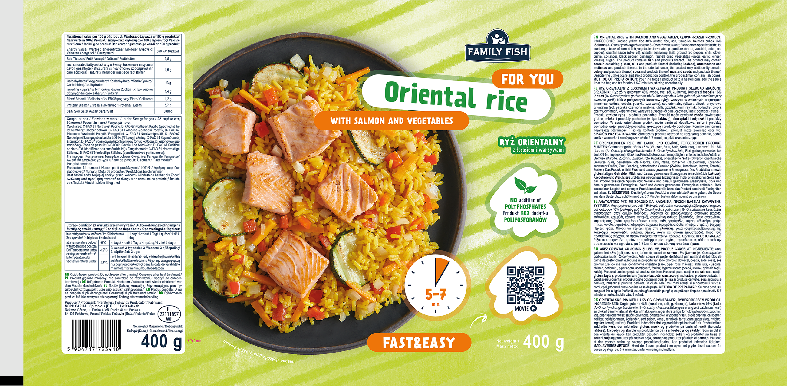 | Składniki | Ryż żółty gotowany 48% (woda, ryż, sól, kurkuma), kosteczki łososia 16% (łosoś (a - oncorhynchus gorbuscha lub b - oncorhynchus keta; gatunki ryb określone przy numerze partii) blok z połączonych kawałków ryby), warzywa w zmiennych proporcjach (marchew, cukinia, cebula, papryka czerwona), sos orientalny (oliwa z oliwek, przyprawa orientalna (sól, papryka czerwona mielona, chilli, goździk, kmin rzymski, kolendra, pieprz czarny, cynamon, koper włoski) warzywa suszone (cebula, czosnek, imbir, pomidor), cukier). |