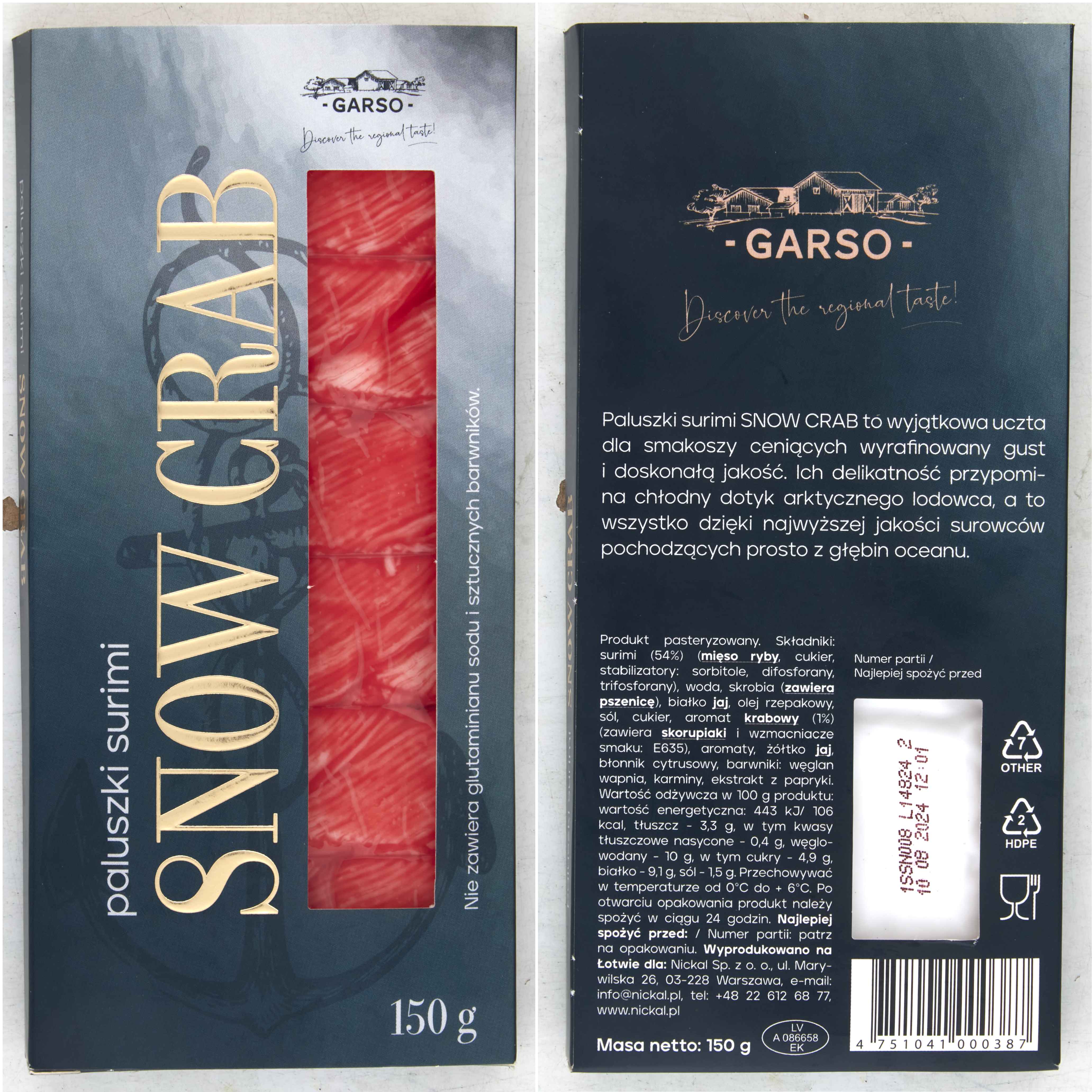 | Składniki | Składniki: surimi (54%) (mięso ryby, cukier, stabilizatory: sorbitole, difosforany, trifosforany), woda, skrobia (zawiera pszenicę), białko jaj, olej rzepakowy, sól, cukier, aromat krabowy (1%) (zawiera skorupiaki i wzmacniacz smaku: E 635), aromaty, żółtko jaj, błonnik cytrusowy, barwniki: węglan wapnia, karminy, ekstrakt z papryki. |