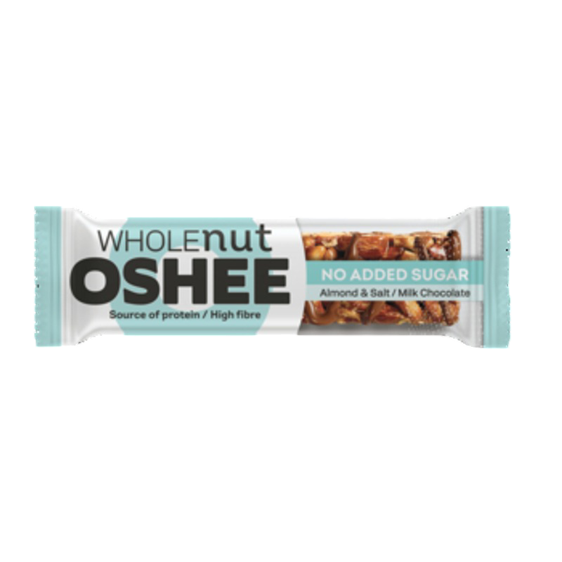 Sięgnij po moc naturalnych składników! OSHEE Wholenut to pyszny baton z migdałami i orzeszkami, oblany mleczną czekoladą z odrobiną soli, wzbogacony witaminami i magnezem. Bez dodatku cukrów, z naturalnie występującymi słodkościami – idealny jako zdrowa przekąska w ciągu dnia.