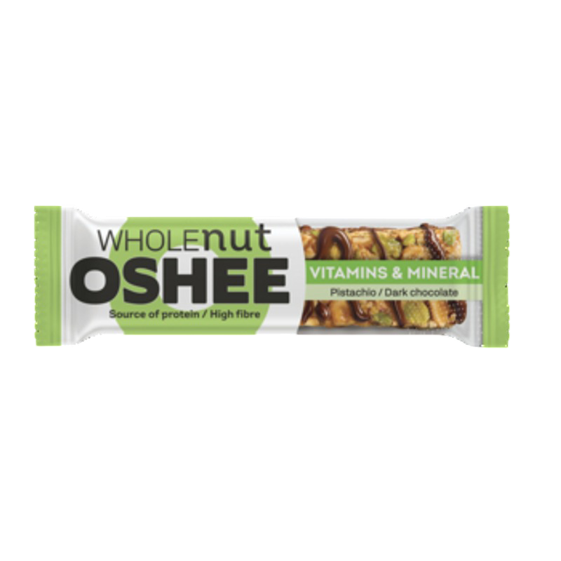 „Poznaj wyjątkową harmonię smaku i wartości odżywczych! Baton OSHEE z orzeszkami arachidowymi, pistacjami i gorzką czekoladą dostarcza naturalnej energii, witamin i magnezu. Idealny jako zdrowa przekąska w ciągu dnia, która łączy chrupiące orzechy, aromatyczną czekoladę i delikatną słodycz miodu.