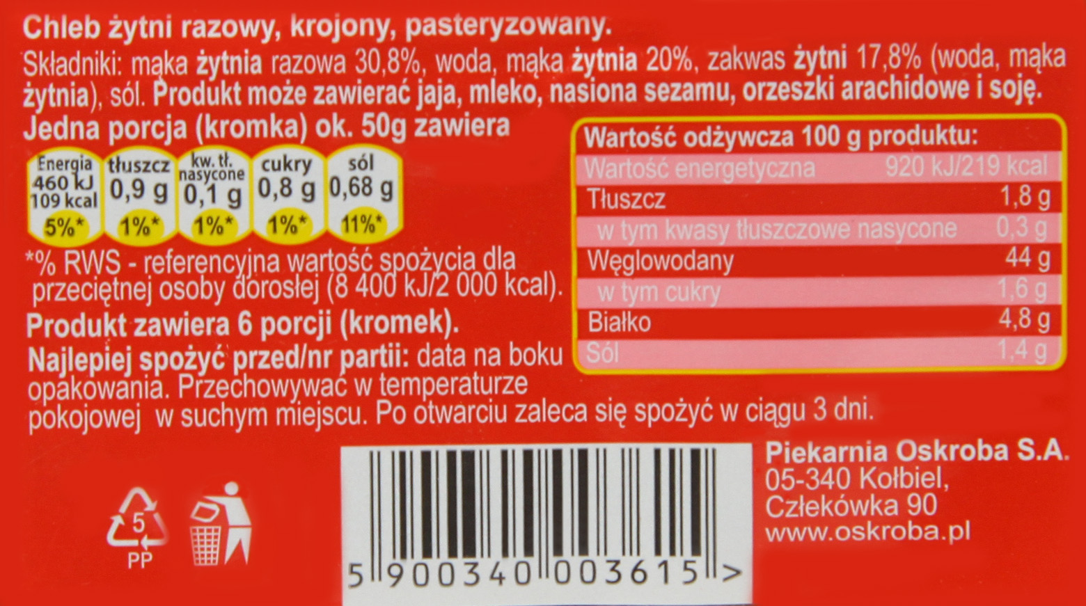 | Składniki | mąka żytnia razowa 30,9%, zakwas żytni 25,5% (mąka żytnia razowa 12,8%, woda), woda, mąka żytnia 20%, sól. |