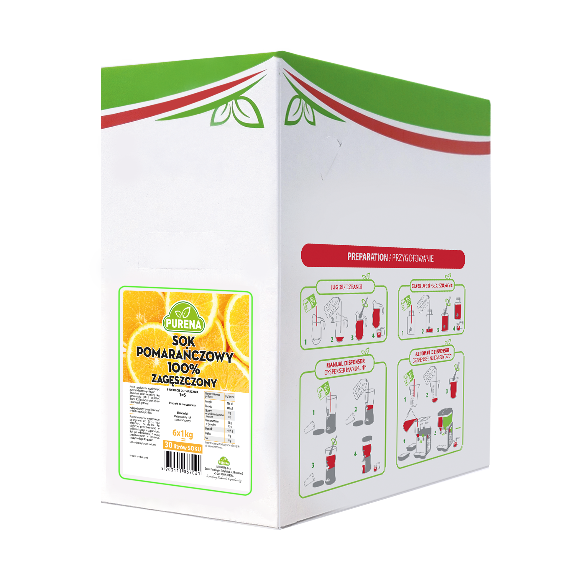Produkty PURENA to innowacyjna oferta SOKÓW 100%, NEKTARÓW oraz NAPOJÓW owocowych w postaci koncentratów do bezpośredniego odtworzenia wodą. Przewaga tego rozwiązania w konfrontacji z sokami w butelkach czy kartonach 1 l wynika z eliminacji wielu zbędnych kosztów takich jak: ilość opakowań, masa transportowa, przestrzeń magazynowa.