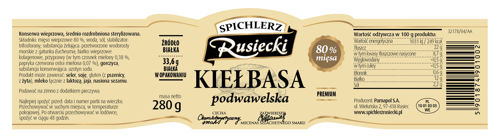 kiełbasa, przygotowana na bazie wysokiej jakości wieprzowiny z dodatkiem starannie dobranych przypraw: gorczycy, papryki ostrej, czosnku i pieprzu białego. Produkt po wyjęciu z opakowania można kroić w plastry nawet 3 mm grubości. Produkt przygotowany bez glutaminianu monosodowego. Podwawelska kiełbasa zawiera 80% mięsa wieprzowego.