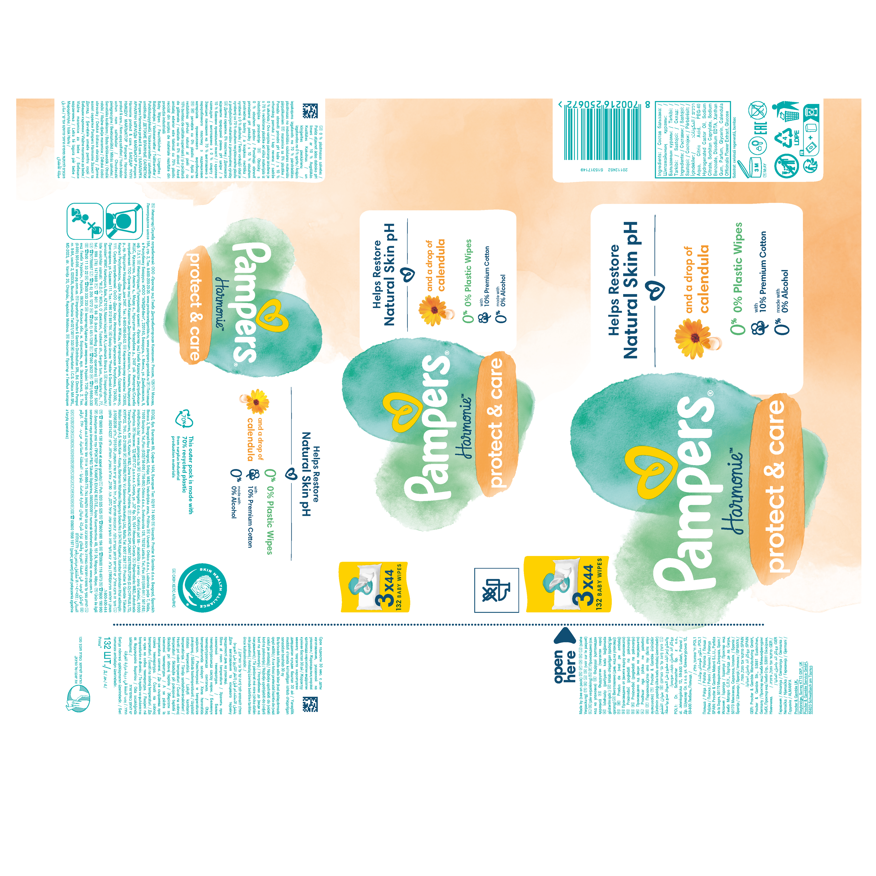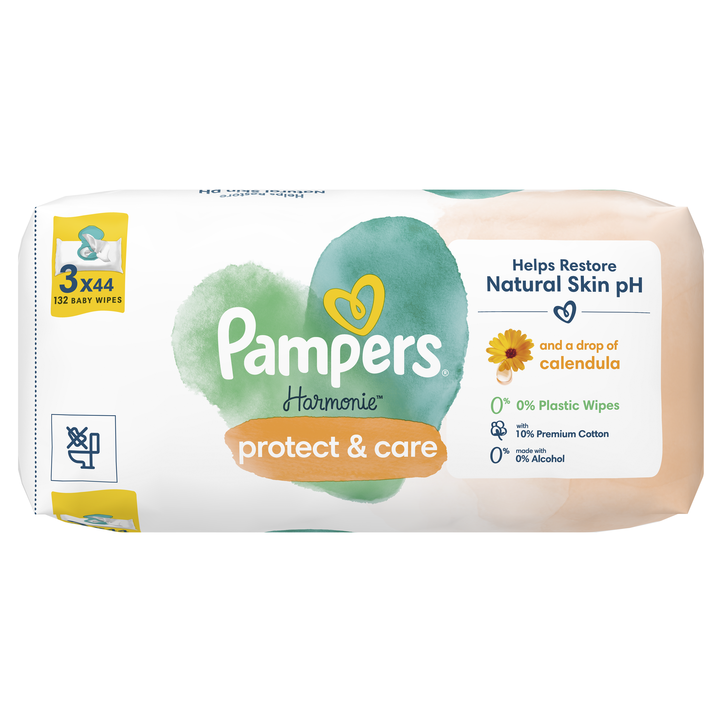 Delikatna ochrona bezcennej skóry Twojego dziecka — z odrobiną nagietka. Chusteczki nawilżane Pampers Harmonie Protect&Care są bardziej delikatne niż sama bawełna i woda. Dzięki unikalnej formule delikatne środki chroniące i oczyszczające skórę pomagają przywrócić ph skóry, chroniąc ją przed podrażnieniami. Nie zawierają alkoholu, 100% włókien pochodzenia roślinnego, z czego 10% to najwyższej jakości bawełna. Formuła została przebadana dermatologicznie i zatwierdzona przez dermatologów z organizacji Skin Health Alliance.