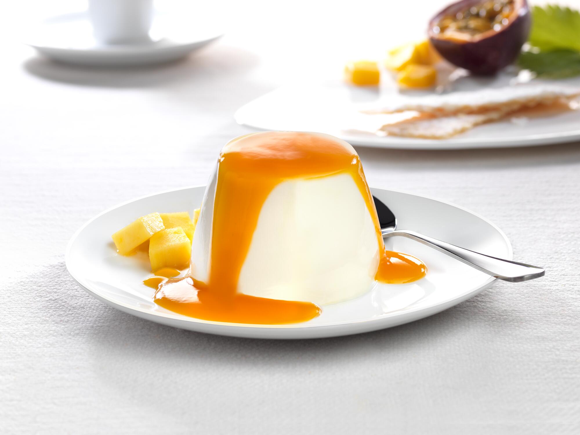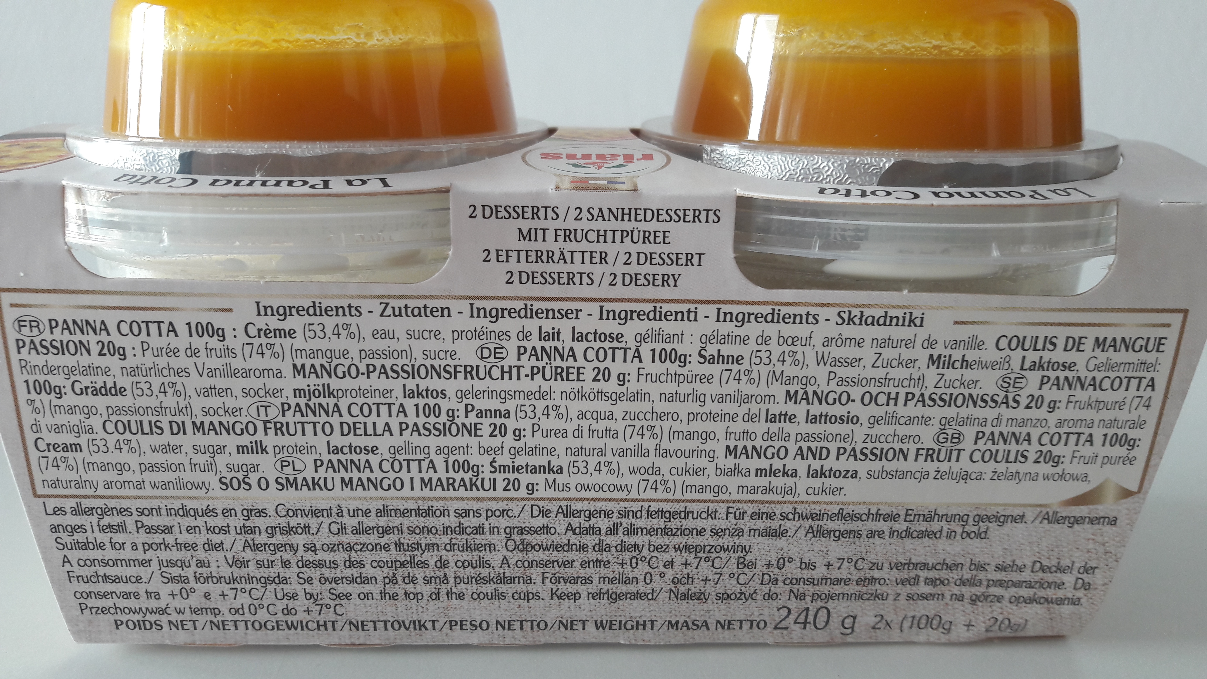| Składniki | Panna cotta 100g: śmietanka (53,4%), woda, cukier, białka mleka, laktoza, substancja żelująca: żelatyna wołowa, aromat waniliowy. sos: 20g: mus owocowy (74%) (mango, marakuja), cukier. |