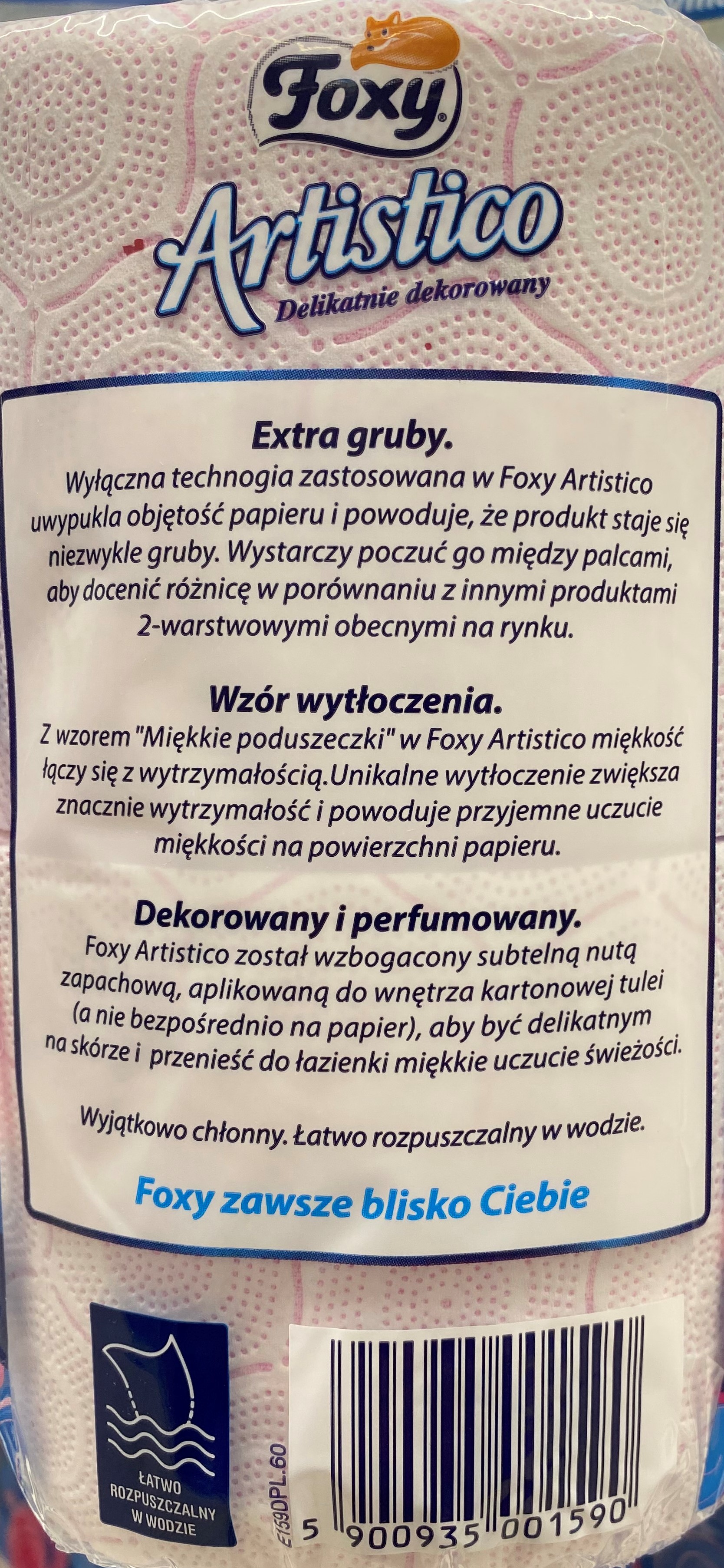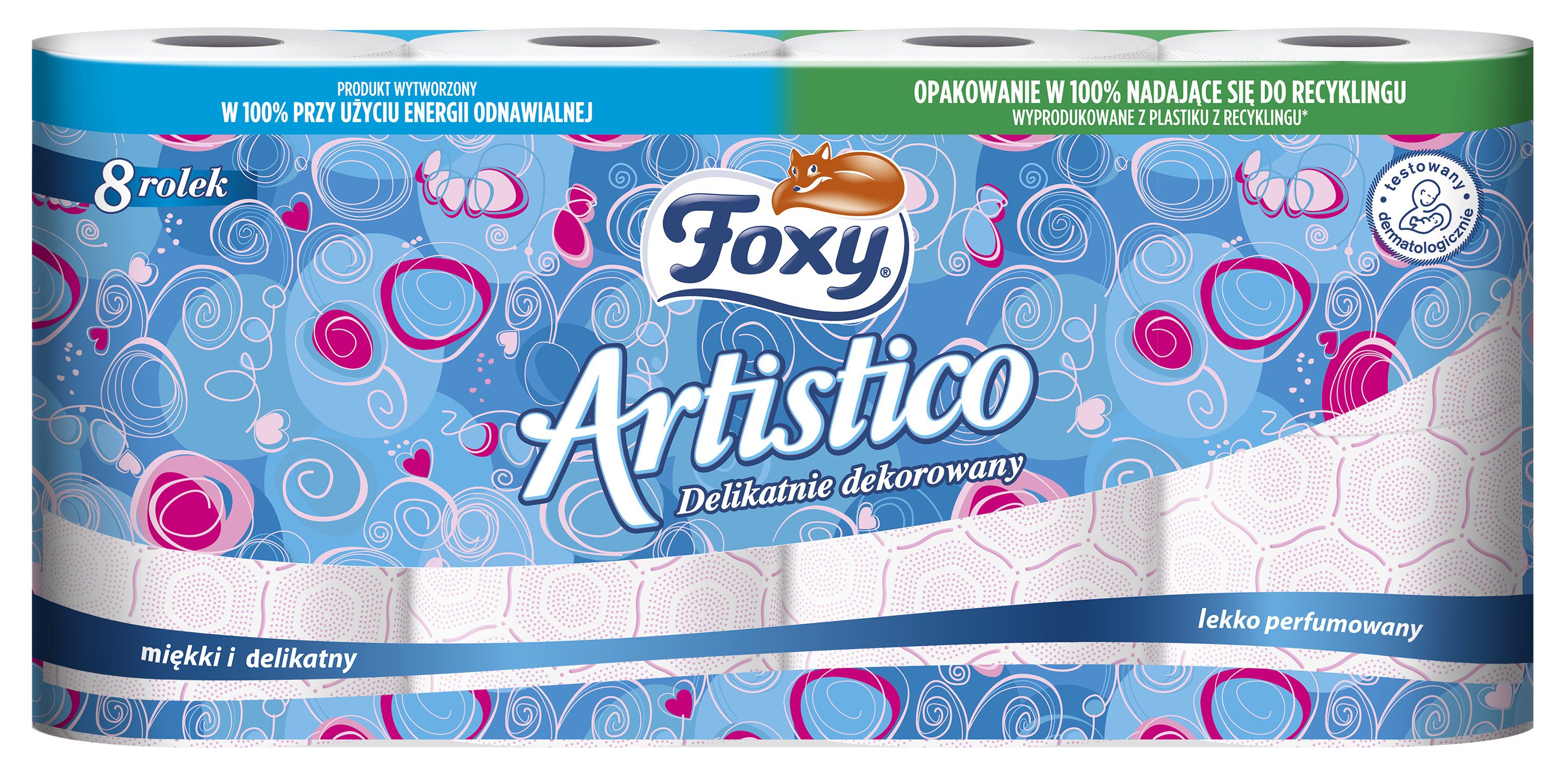 Papier toaletowy Foxy Artistico, 2 warstwowy to idealna proporcja pomiędzy miękkością i wytrzymałością o niepowtarzalnym i wyróżniającym się wzorze wytłoczenia „Miękkie Poduszeczki”.