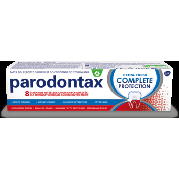 Zdrowie zębów zaczyna się od zdrowych dziąseł. Pasta do zębów Parodontax Complete Protection Extra Fresh to 8 specjalnie zaprojektowanych korzyści dla zdrowszych dziąseł i mocniejszych zębów: pomaganie w zatrzymaniu i zapobieganiu krwawienia dziąseł, zmniejszenie zaczerwienienia i stanu zapalnego dziąseł, usuwanie płytki nazębnej, uszczelnienie dziąseł, odświeżenie oddechu, wzmocnienie szkliwa, głębokie czyszczenie i wybielanie! Specjalnie zaprojektowany skład pasty jest po to, by pomóc w zapobieganiu problemom z dziąsłami poprzez usuwanie płytki nazębnej. Dzięki temu zapewnia zdrowsze dziąsła i mocniejsze zęby. Formuła z wodorowęglanem sodu sprawia, że pasta bardzo skutecznie usuwa płytkę nazębną, której gromadzenie się na zębach i wokół nich jest najczęstszą przyczyną krwawienia oraz nieświeżego oddechu. Pasta o 58% skuteczniej zmniejsza krwawienie dziąseł.* Pomaga również zmniejszyć obrzęk dziąseł oraz zachować szczelność połączenia między zębami i dziąsłami, a dzięki fluorkowi aktywnie wzmacnia szkliwo. Specjalistyczną i odświeżającą pastę Parodontax Complete Protection Extra Fresh stosuj już teraz, zatrzymaj krwawienie dziąseł! Produkt usuwa też przebarwienia, przywracając zębom ich biel. Pasta zapewnia głębokie oczyszczenie jamy ustnej, a przyjemny miętowy smak pozostawia uczucie świeżości. Regularnie stosowana pozwala doświadczać wszystkich 8 korzyści. *W porównaniu do 21% przy stosowaniu zwykłej pasty do zębów. Przy szczotkowaniu zębów dwa razy dziennie.