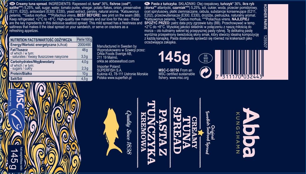 | Składniki | Olej rzepakowy, tuńczyk (36%), ikra ryb dorsz atlantycki, czarniak 5,25%, sól, cukier, przecier pomidorowy, woda, ocet spirytusowy, płatki ziemniaczane, cebula, substancja konserwująca: e211i e202, przeciwutleniacze: e300 i e330, drożdże, pietruszka, aromat |