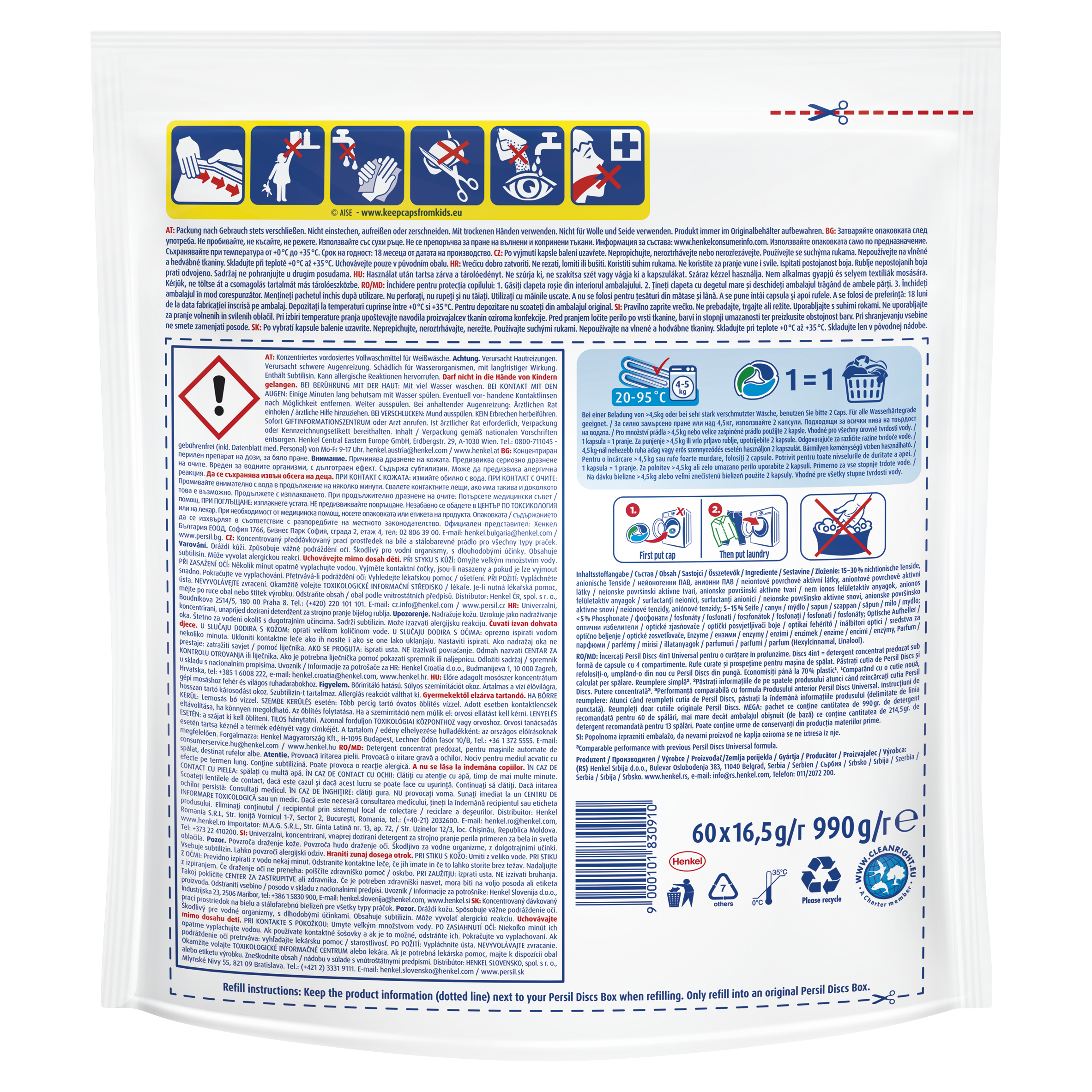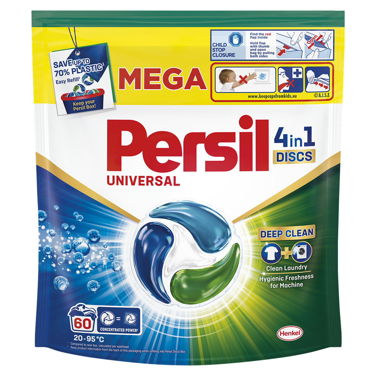 Silna formuła Persil Discs Deep Clean 4w1 Universal wnika głęboko we włókna rozpuszczając uporczywe plamy i usuwając je. Persil Discs zapewniają czystość ubrań, jednocześnie zachowując blask i promienny wygląd bieli, nawet po wielokrotnym praniu. Persil trafia głęboko również do elementów pralki, aby zwalczyć nieprzyjemne zapachy, pozostawiając ją czystą i higienicznie świeżą.