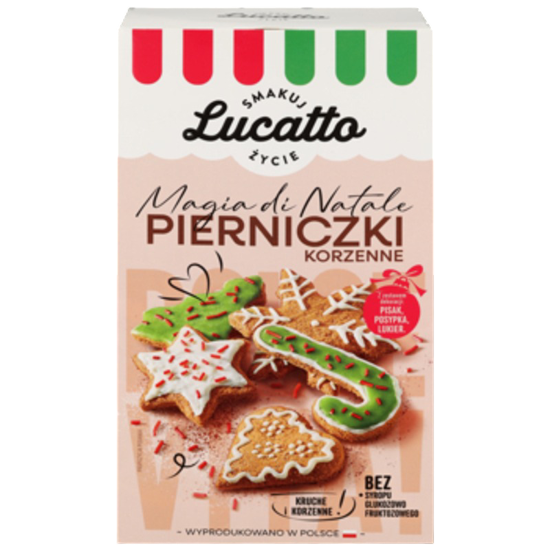 | Składniki | Pierniczki składniki: mąka pszenna, cukier, kakao w proszku o obniżonej zawartości tłuszczu, przyprawy korzenne, ekstrakt słodu jęczmiennego, substancje spulchniające: węglany sodu; sól, aromaty. lukier zielony składniki: cukier, glukoza, regulator kwasowości: kwas cytrynowy; barwnik: karoteny, błękit brylantowy fcf. posypka dekoracyjna czerwona składniki: cukier, tłuszcz palmowy, glukoza, barwniki: karmin, kurkumina; substancje glazurujące: wosk carnauba, szelak. pisak biały składniki: cukier, tłuszcze roślinne (palmowy, z ziaren palmowych), serwatka w proszku (z mleka), mleko odtłuszczone w proszku, emulgatory: lecytyny; regulator kwasowości: kwas cytrynowy; aromat naturalny |