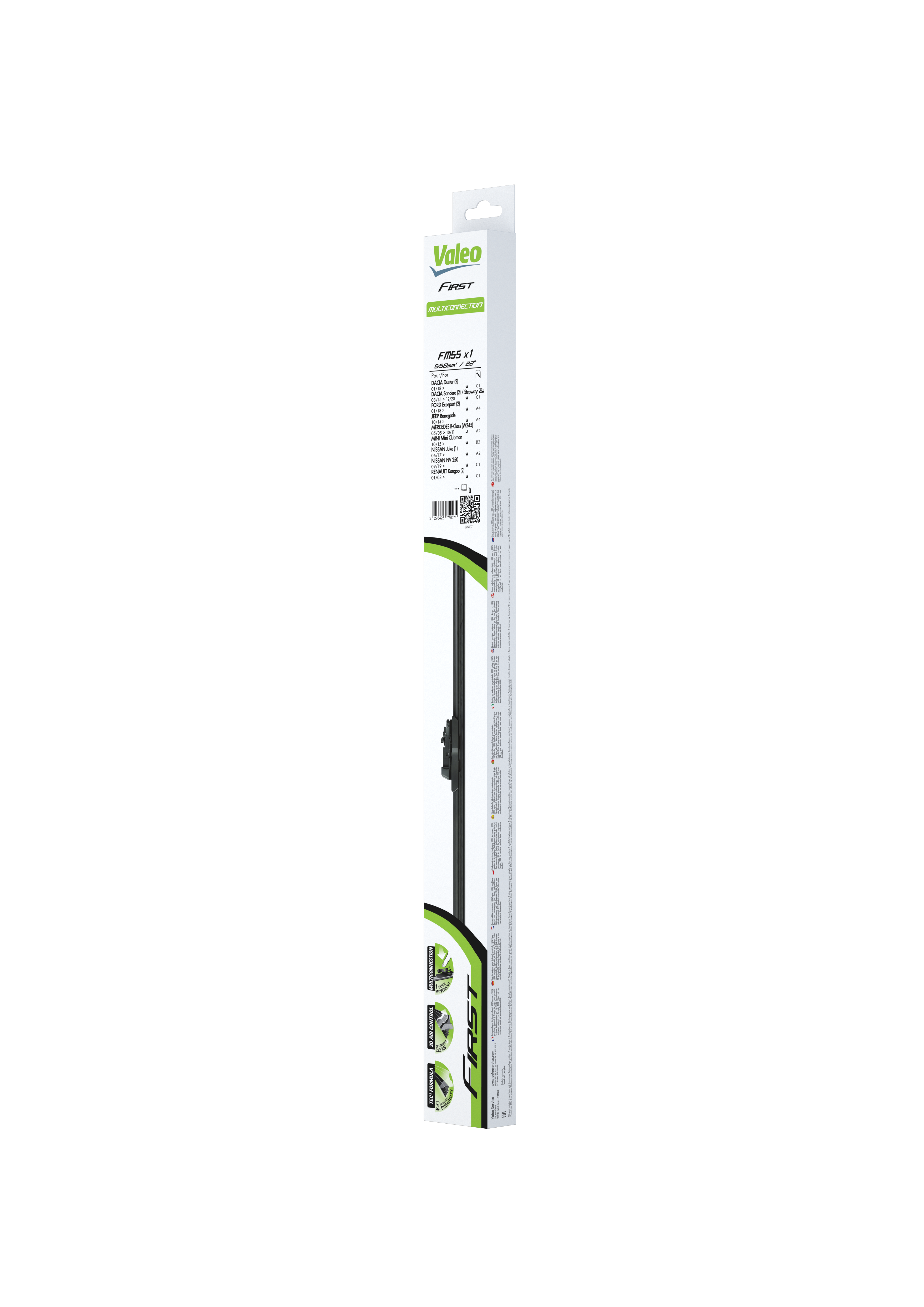 Pióro wycieraczki Valeo First Multiconnection 550mm, nowa ulepszona gama płaskich wycieraczek wysokiej jakości. Linia ta zawiera nowe adaptery, które zapewniają jeszcze szersze pokrycie rynku. Z nowym systemem adapterów i tylko jedną dodatkową referencją, najnowsza gama wycieraczek pokrywa ponad 28 milionów samochodów więcej niż poprzednia. Na liście nowych aplikacji znalazły się m.in. BMW X1 (2015>), FORD Ka+ (2016>) oraz RENAULT Megane (2016>). Nowa linia Valeo First Multiconnection wprowadza dwie kluczowe zmiany: • Możliwość łatwego montażu wycieraczek na dwóch dodatkowych rodzajach ramion wycieraczek, które są standardowo stosowane w samochodach BMW i grupy VAG. • Wprowadzona została do oferty dodatkowa referencja o niestandardowej długości. Mierzące 750 mm pióro wycieraczki umożliwia dopasowanie produktów do coraz bardziej popularnych samochodów z większą przednią szybą, takich jak na przykład Citroen C4, Ford S-Max czy Peugeot 3008. Pełna gama zawiera teraz 12 referencji z łatwym do zrozumienia systemem adapterów, wykorzystującym technologię Valeo Uni-click™. Idea systemu Valeo Uni-clickTM polega na zapewnieniu maksymalnie 4 adapterów obejmujących większość ramion wycieraczek z przejrzystą instrukcją montażu nadrukowaną bezpośrednio na opakowaniu. Ten praktyczny system został zaprojektowany tak, aby montaż wycieraczek był szybszy i łatwiejszy, zgodnie z filozofią Valeo Service "We Care For You" („Dbamy o Ciebie”). Nowa, rozszerzona gama Valeo First Multiconnection otwiera przed warsztatami możliwość zaopatrzenia się w niedrogi, wysokiej jakości asortyment, który jest łatwy w sprzedaży, prosty w montażu oraz daje gwarancję satysfakcji klienta. Ze względu na niewielką liczbę referencji pokrywającą szeroką gamę pojazdów nie trzeba mieć na stanie magazynowym dużego asortymentu, aby od ręki móc zaoferować klientom dopasowany produkt.
