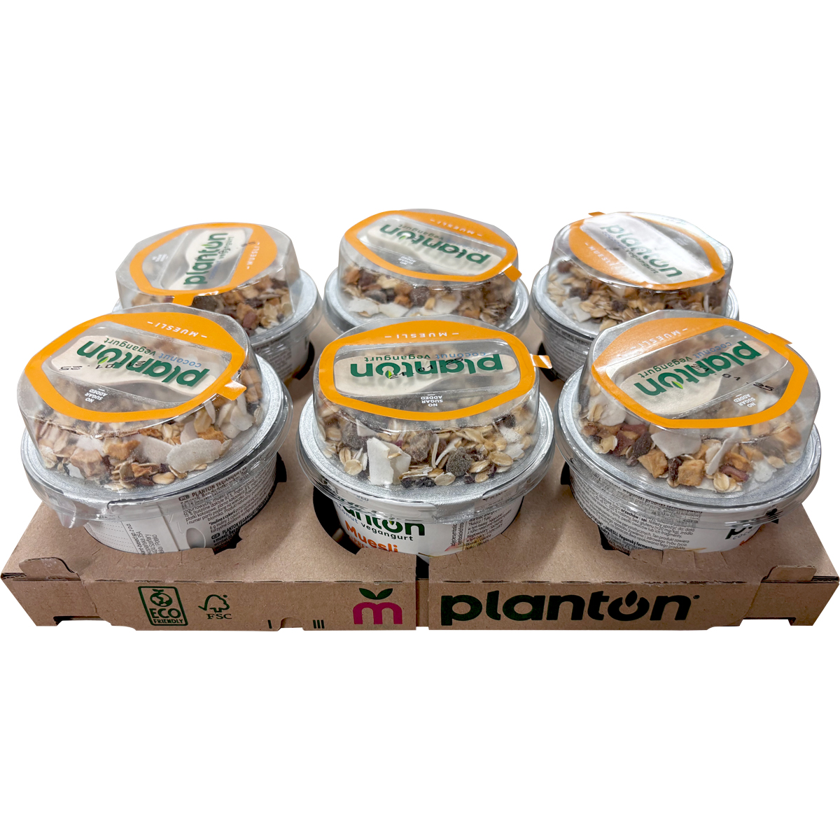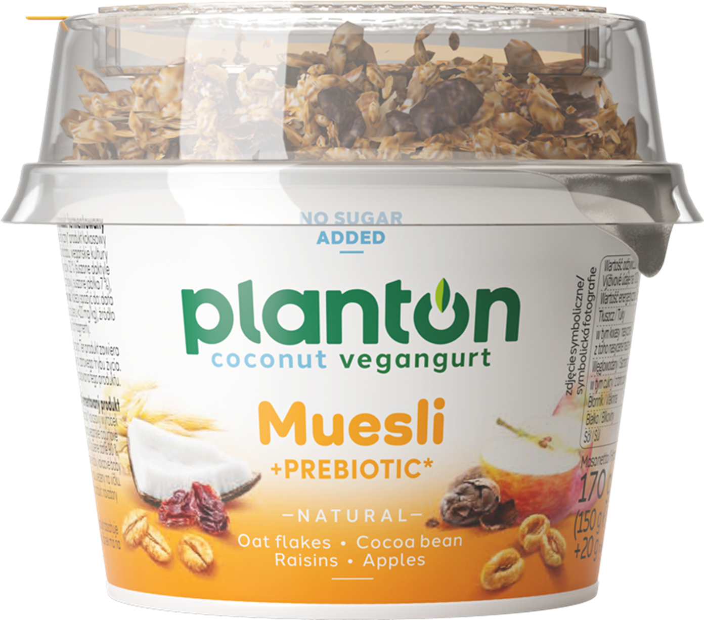 | Składniki | Wegański prebiotyczny* produkt kokosowy 88,2 % [mleczko kokosowe 91,7 % (woda, ekstrakt z kokosa), inulina (błonnik z cykorii) 4 %, skrobia, białka bobu, wegańskie kultury bakterii jogurtowych], muesli bezglutenowe 11,8 % (płatki owsiane bezglutenowe* 44 %, mieszanka owoców 32 % (suszone daktyle 15 % (suszone daktyle 90 %, mąka ryżowa), suszone rodzynki 10 % (suszone rodzynki 99,5 %, olej słonecznikowy), suszone jabłka 7 %), płatki kokosowe, ziarno kakaowca 8 %, mąka ryżowa. |