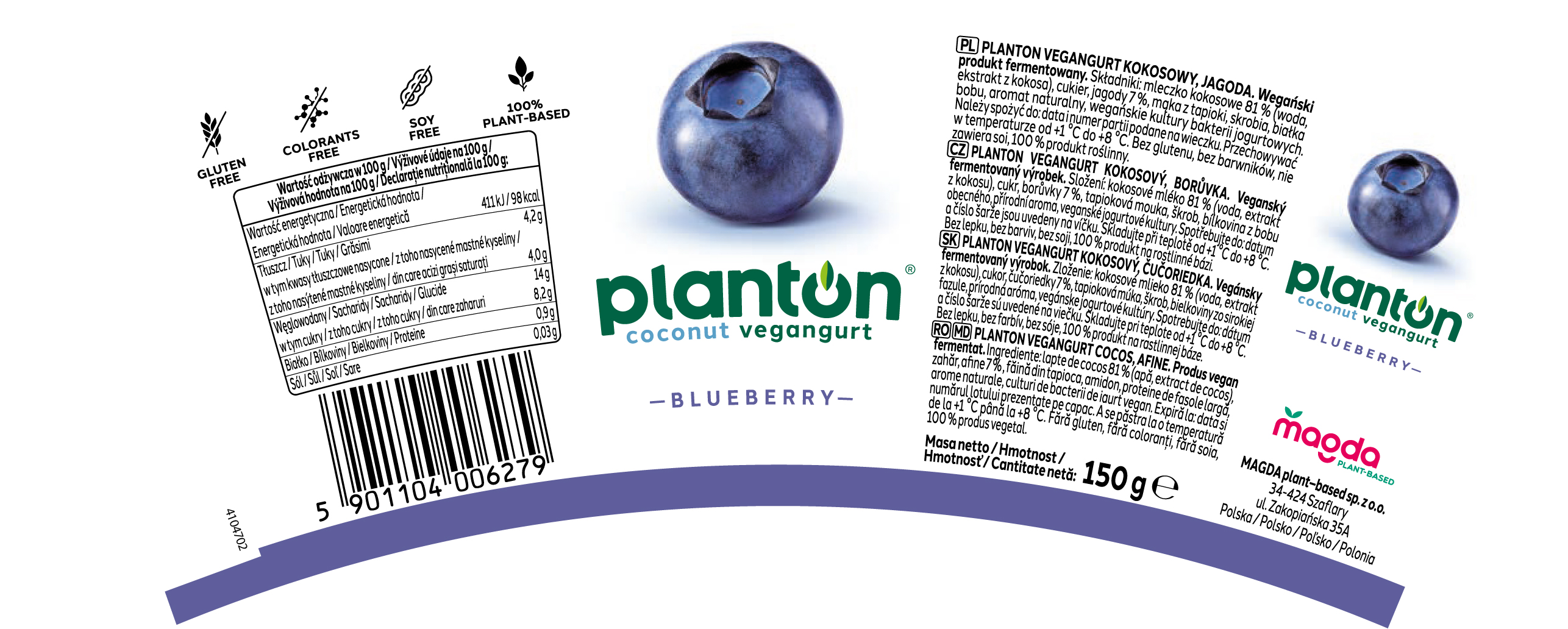 | Składniki | Mleczko kokosowe 81 % (woda, ekstrakt z miąższu kokosa), cukier, jagody 7 %, mąka tapiokowa, skrobia, białka bobu, aromat , wegańskie kultury bakterii jogurtowych. |