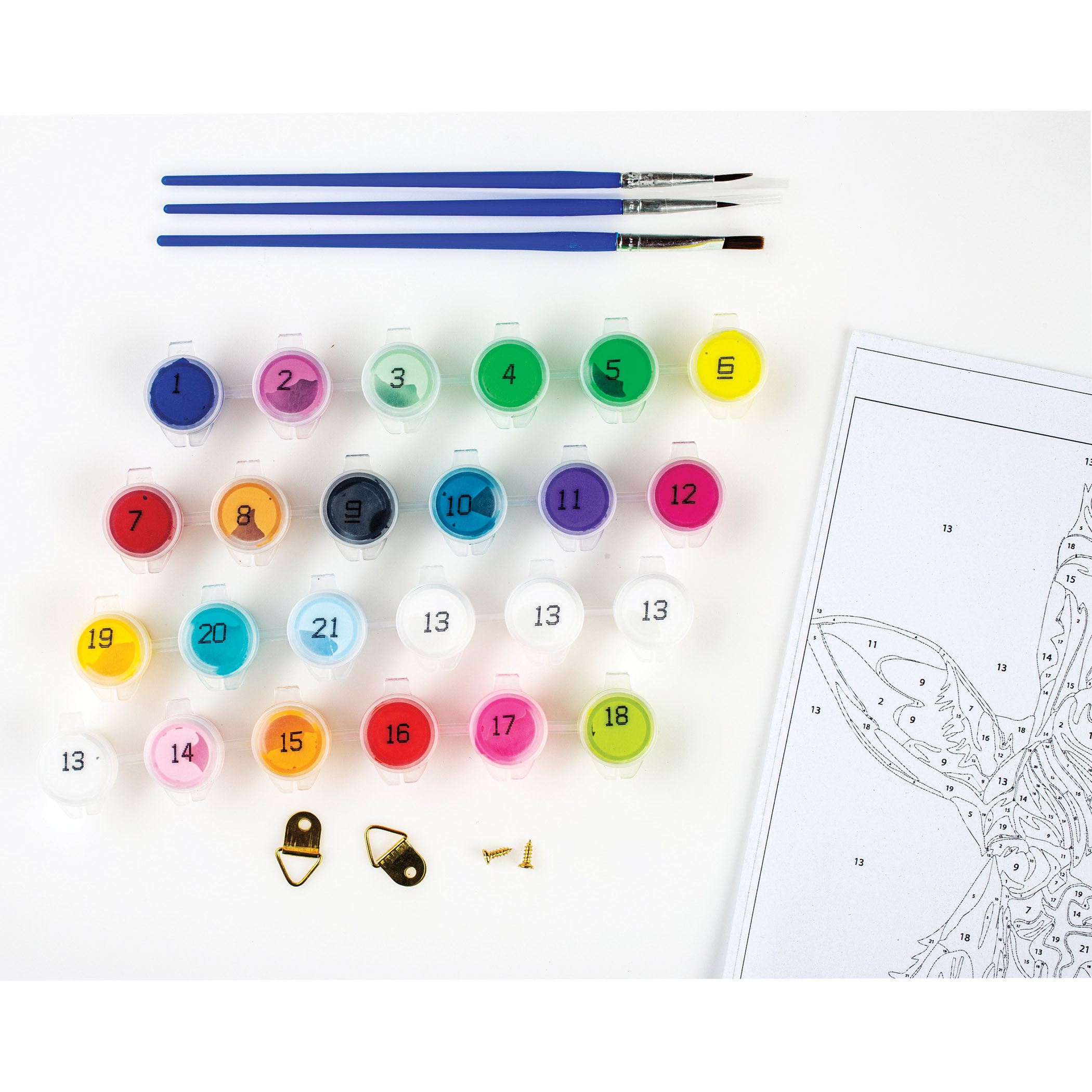 Opakowanie zawiera płótno malarskie w rozmiarze 400x500mm ze szkicem Nocny Spacer z naniesionymi numerkami , 3 pędzelki, zestaw farb akrylowych odpowiednio ponumerowanych, haczyki do powieszenia.