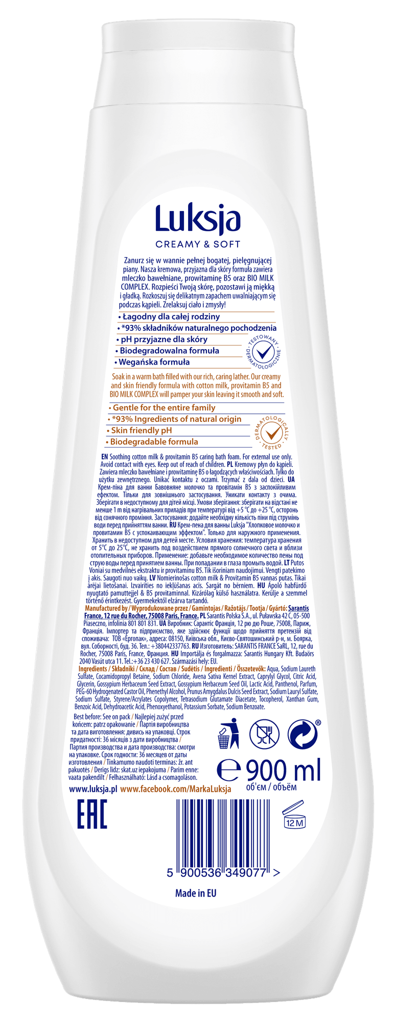 Zanurz się w wannie pełnej bogatej, pielęgnującej piany. Kremowa, przyjazna dla skóry formuła Luksja Creamy & Soft zawiera mleczko bawełniane, prowitaminę B5 oraz BIO MILK COMPLEX. Rozpieści Twoją skórę, pozostawi ją miękką i gładką. Rozkoszuj się delikatnym zapachem uwalniającym się podczas kąpieli. Zrelaksuj ciało i zmysły! Testowany dermatologicznie. Łagodny dla całej rodziny. pH przyjazne dla skóry. Biodegradowalna i wegańska formuła. 93% składników pochodzenia.