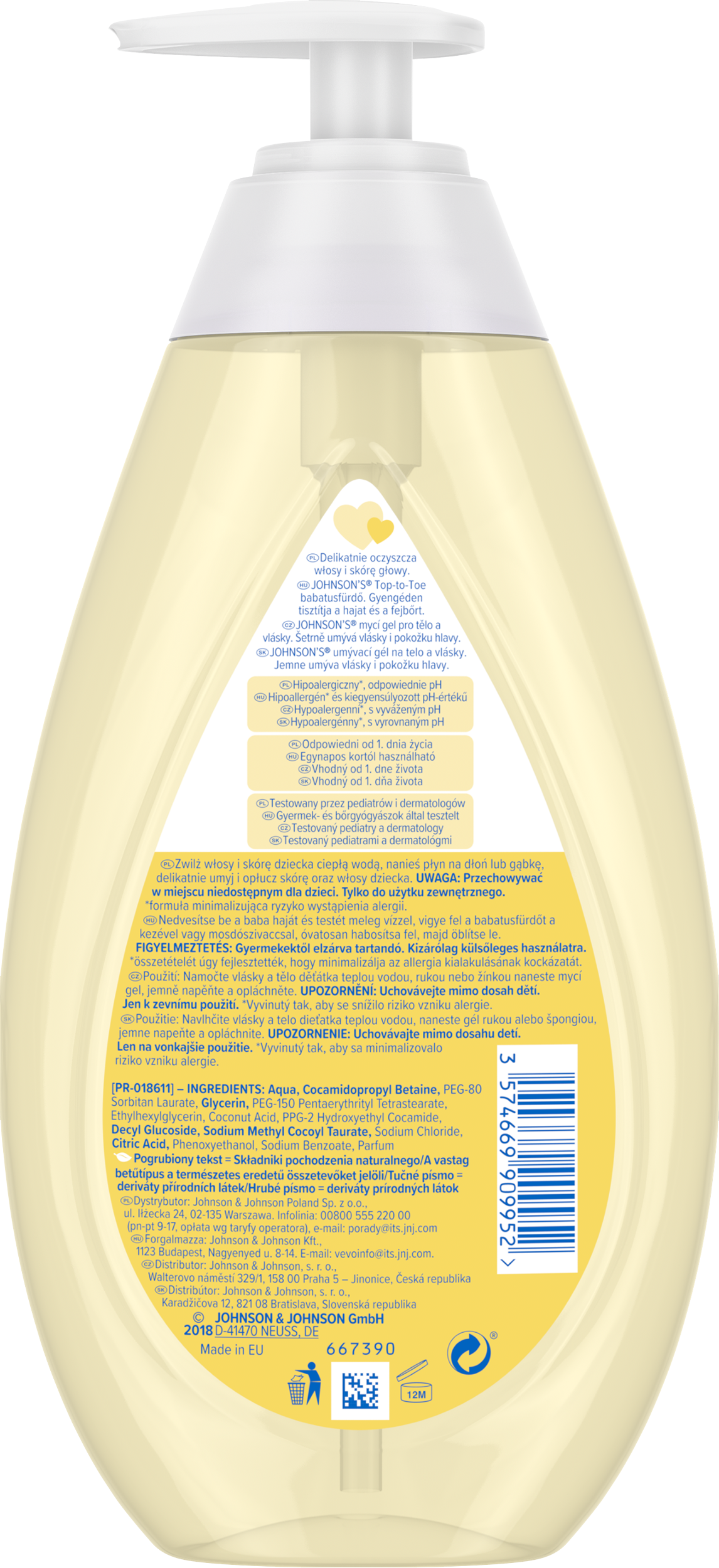 • Hipoalergiczny* • pH odpowiednie dla delikatnej skóry dziecka • Testowany przez pediatrów i dermatologów. • Nie zawiera barwników, parabenów, SLS i SLES. • Z wyjątkowo łagodną formułą No More Tears®. Jest łagodny dla oczu jak czysta woda. • Łagodna i delikatna pielęgnacja noworodka. Odpowiedni od 1. dnia życia. • Delikatnie oczyszcza włosy i skórę głowy. Po narodzinach skóra noworodka jest wyjątkowo delikatna. Dlatego od ponad 125 lat doskonalimy formuły naszych produktów, aby były jeszcze łagodniejsze. Nasz Johnson’s Top-to-Toe® płyn do mycia ciała i włosów jest testowany klinicznie - łagodny jak czysta woda. Wybieramy wyłącznie wysokiej jakości składniki, które są delikatne dla dzieci. Dlatego odrzuciliśmy ponad 400 składników, które nie spełniają naszych standardów Best for Baby™. *formuła minimalizująca ryzyko wystąpienia alergii.
