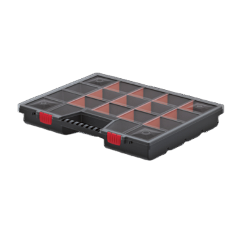 Organizer NOR20 - sprawdza się zarówno w przechowywaniu drobnych, jak i trochę większych elementów dzięki systemowi przegródek. Sami możemy regulować ich długość, dostosować ją do wielkości przedmiotów jakie chcemy przechowywać. Organizer wyposażony jest w poręczny uchwyt i plastikowe zapięcia.