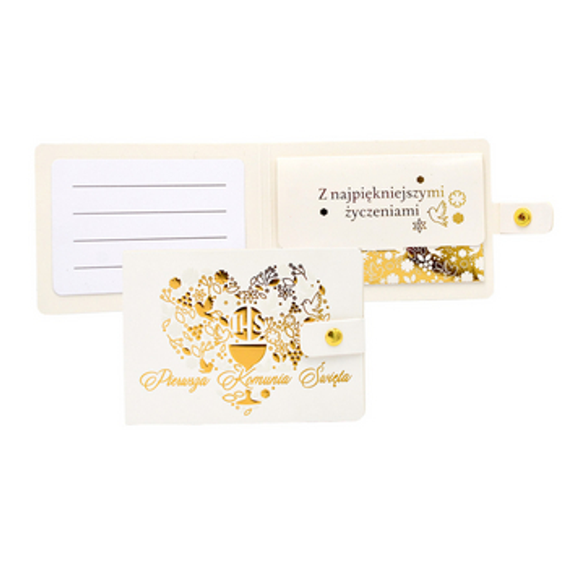 Portfeliki z życzeniami to alternatywa dla tradycyjnych kartek, są wyjątkowym sposobem na podarowanie bliskiej osobie banknotu. Portfeliki są kolorowe i uszlachetnione metalizowaną folią hot-stamp, oraz są wyposażone w zamknięcie na zatrzask, co umożliwia ich wielokrotne otwieranie i zamykanie - jak w prawdziwym portfelu. Portfeliki zawierają niebanalne teksty oraz życzenia w środku. Specyfikacja: wymiary: 11 x 8 cm (po złożeniu) wnętrze: życzenia w środku waga: 13 g okazja: Komunia Święta